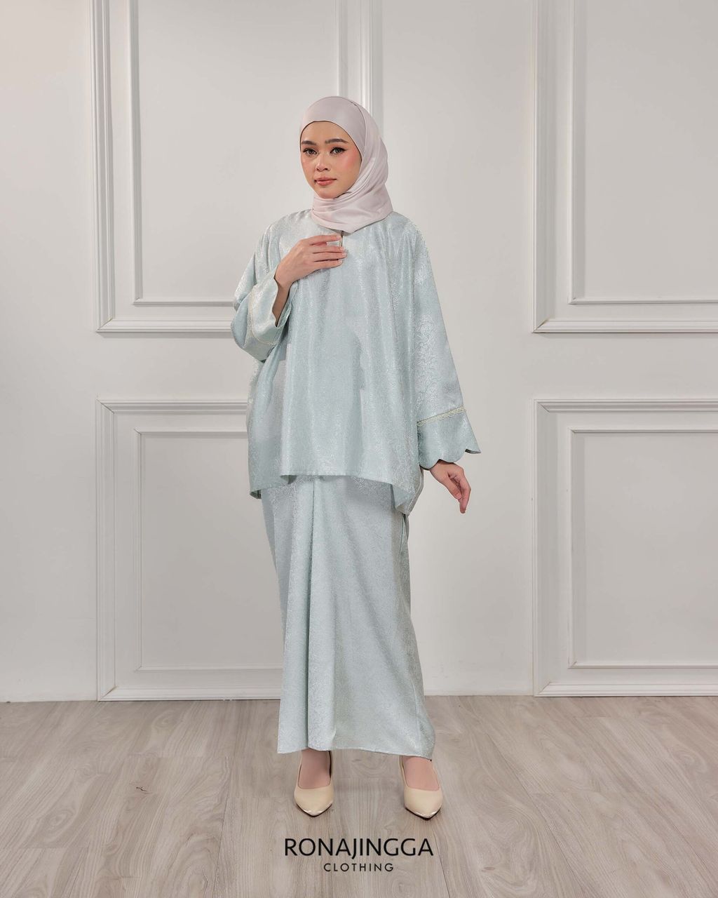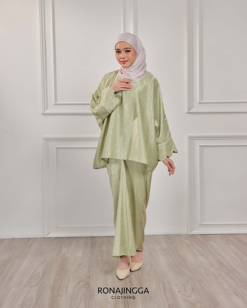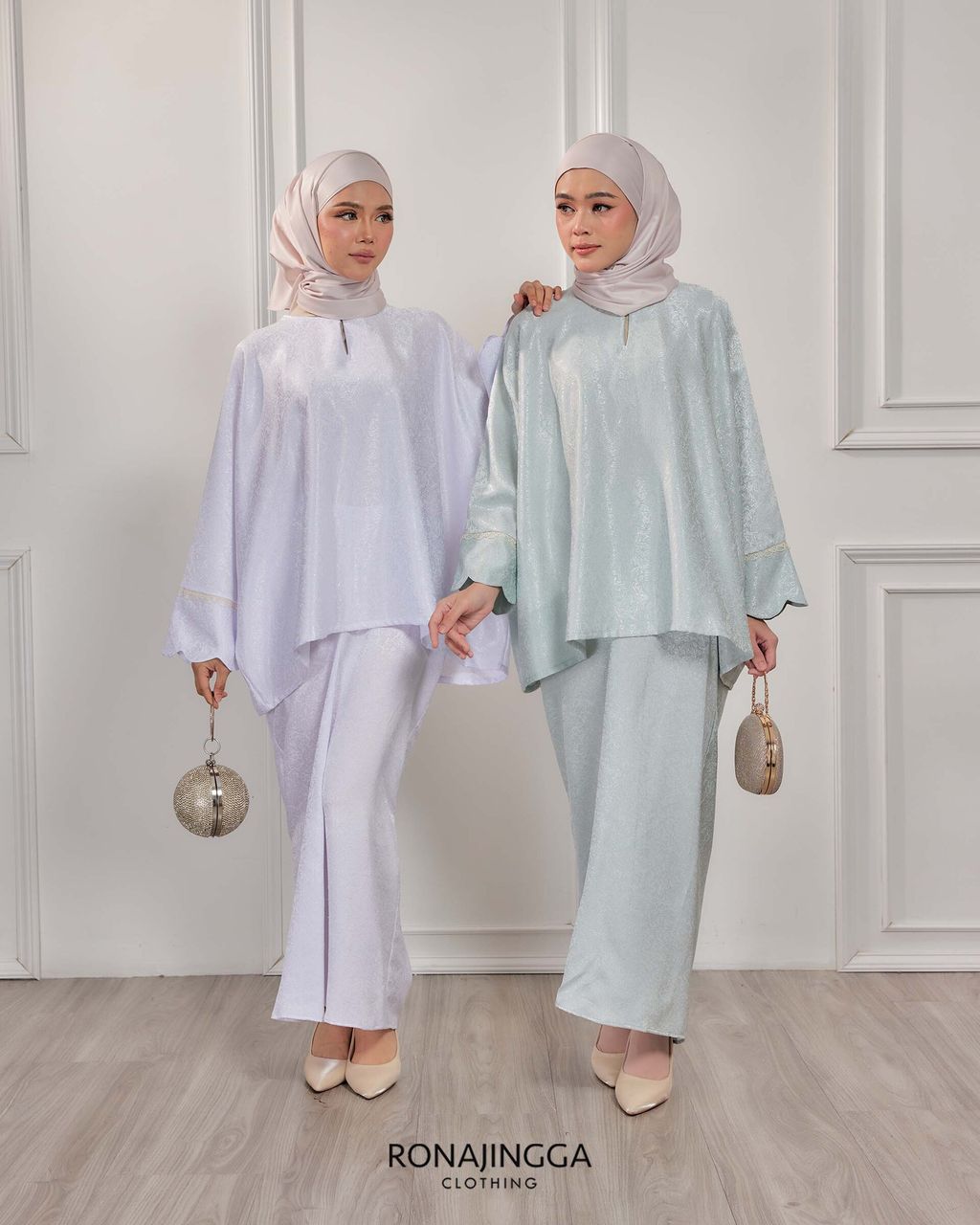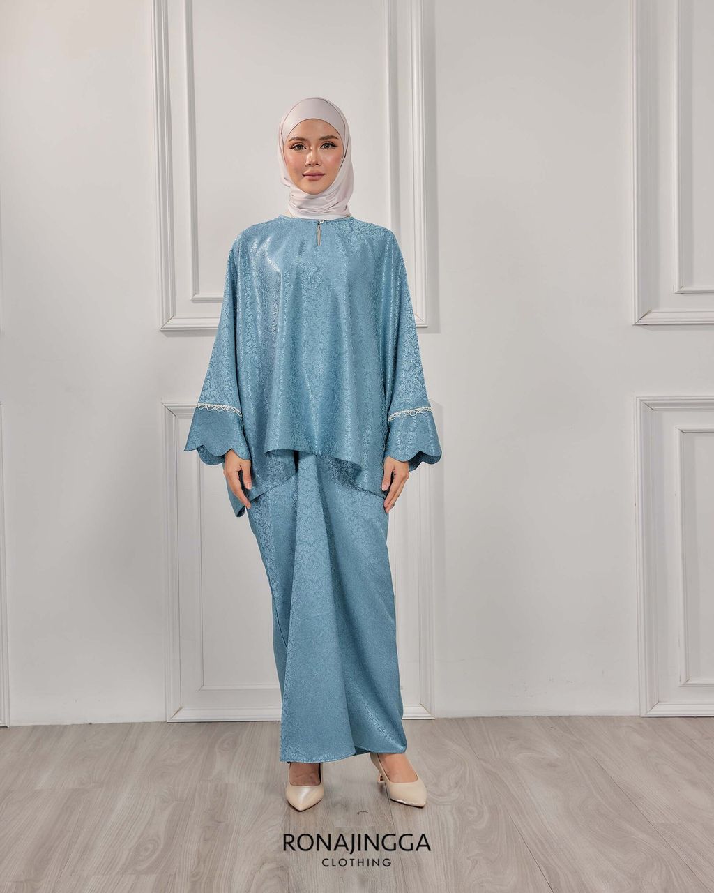 It is a loose, elegant and minimal baggy kurung made from High Quality Premium Brocade that is Soft, Cooling & Flowy with wuduk friendly wide sleeves with cute scallop design , that fits nicely on any body shape and cooling to wear from day to night. The top is a loose baggy top that can even be easily pulled up for breastfeeding and comfortably loose enough for preggy mommy.