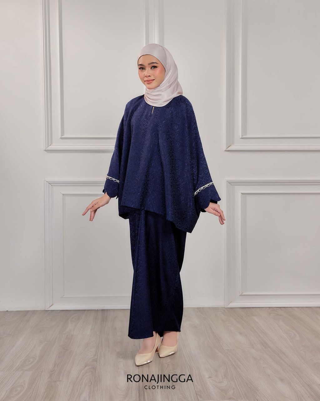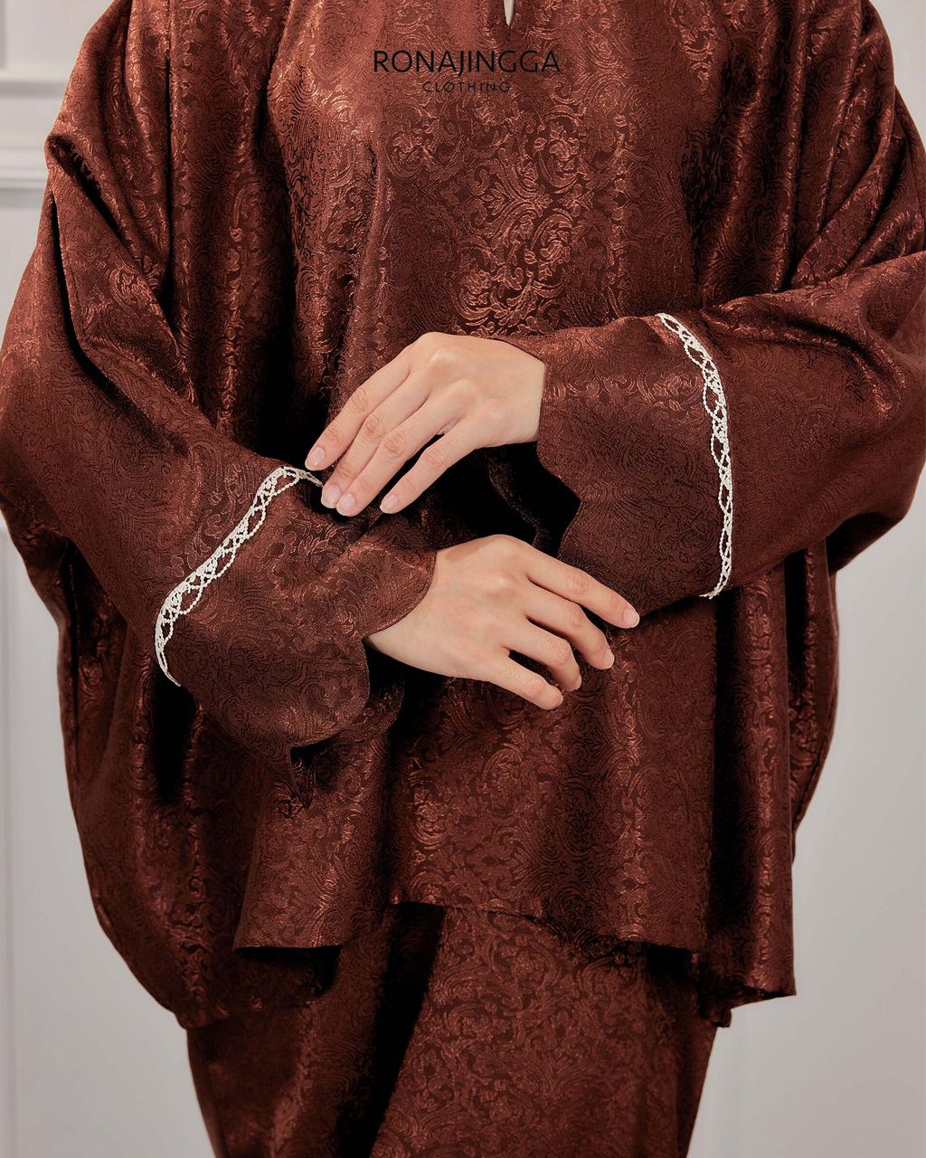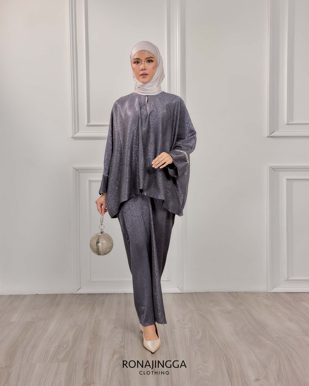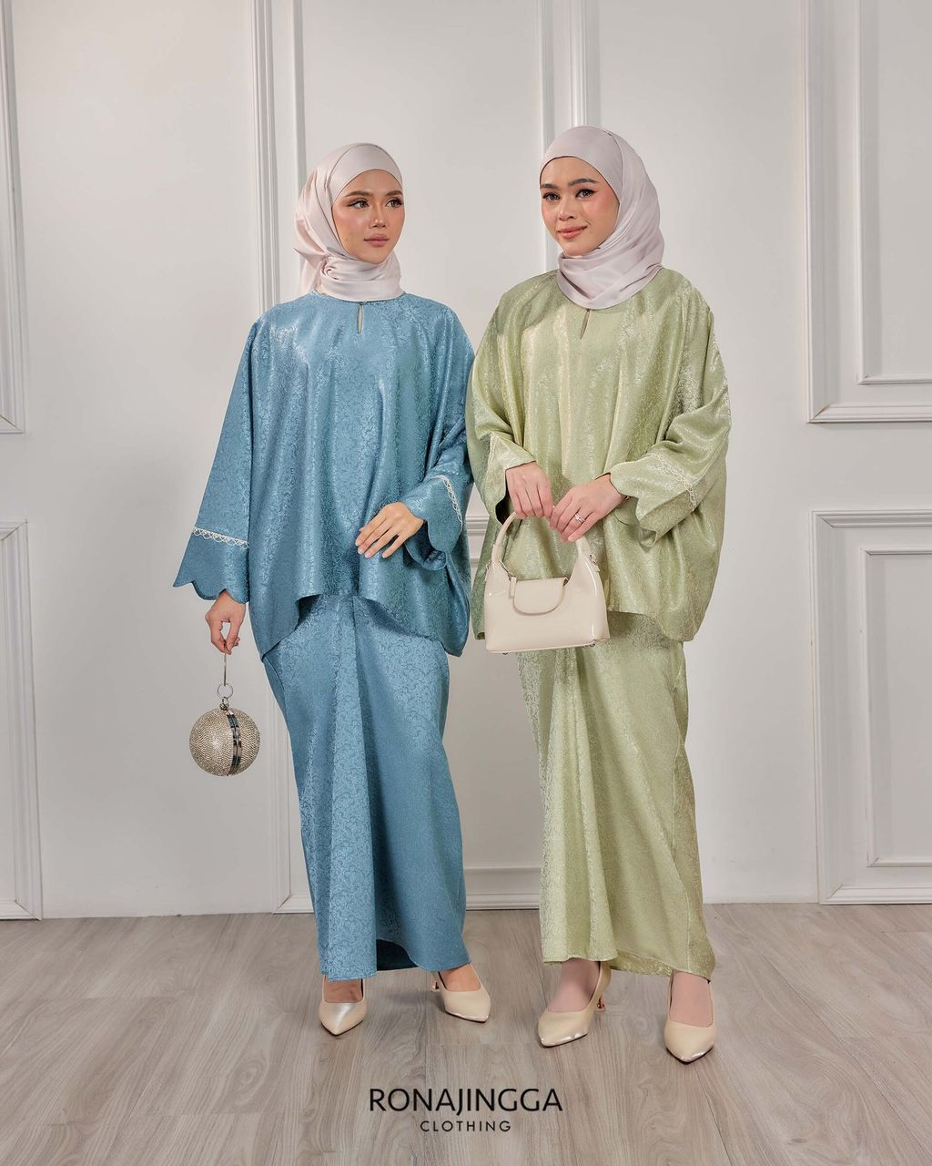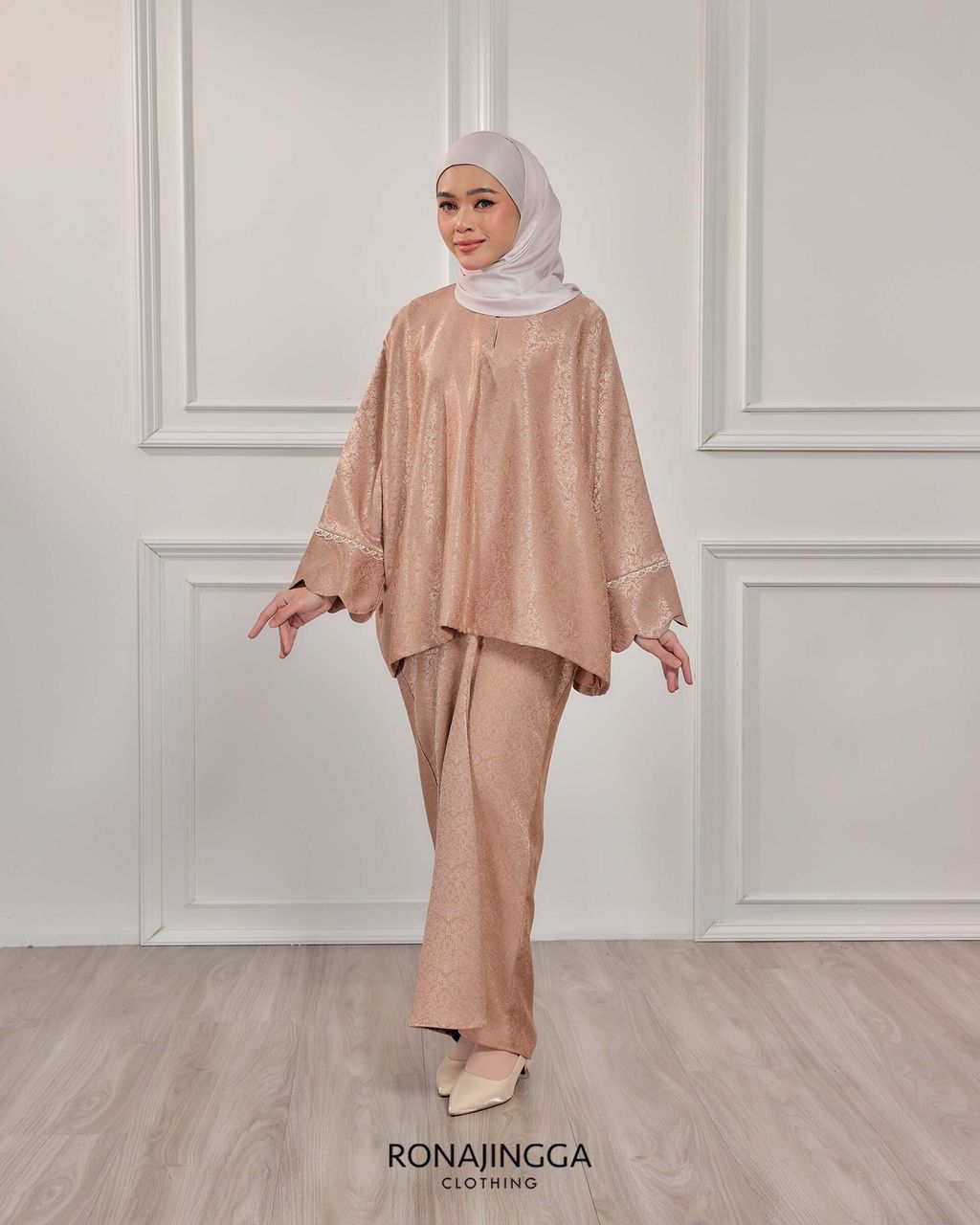 It is a loose, elegant and minimal baggy kurung made from High Quality Premium Brocade that is Soft, Cooling & Flowy with wuduk friendly wide sleeves with cute scallop design , that fits nicely on any body shape and cooling to wear from day to night. The top is a loose baggy top that can even be easily pulled up for breastfeeding and comfortably loose enough for preggy mommy.