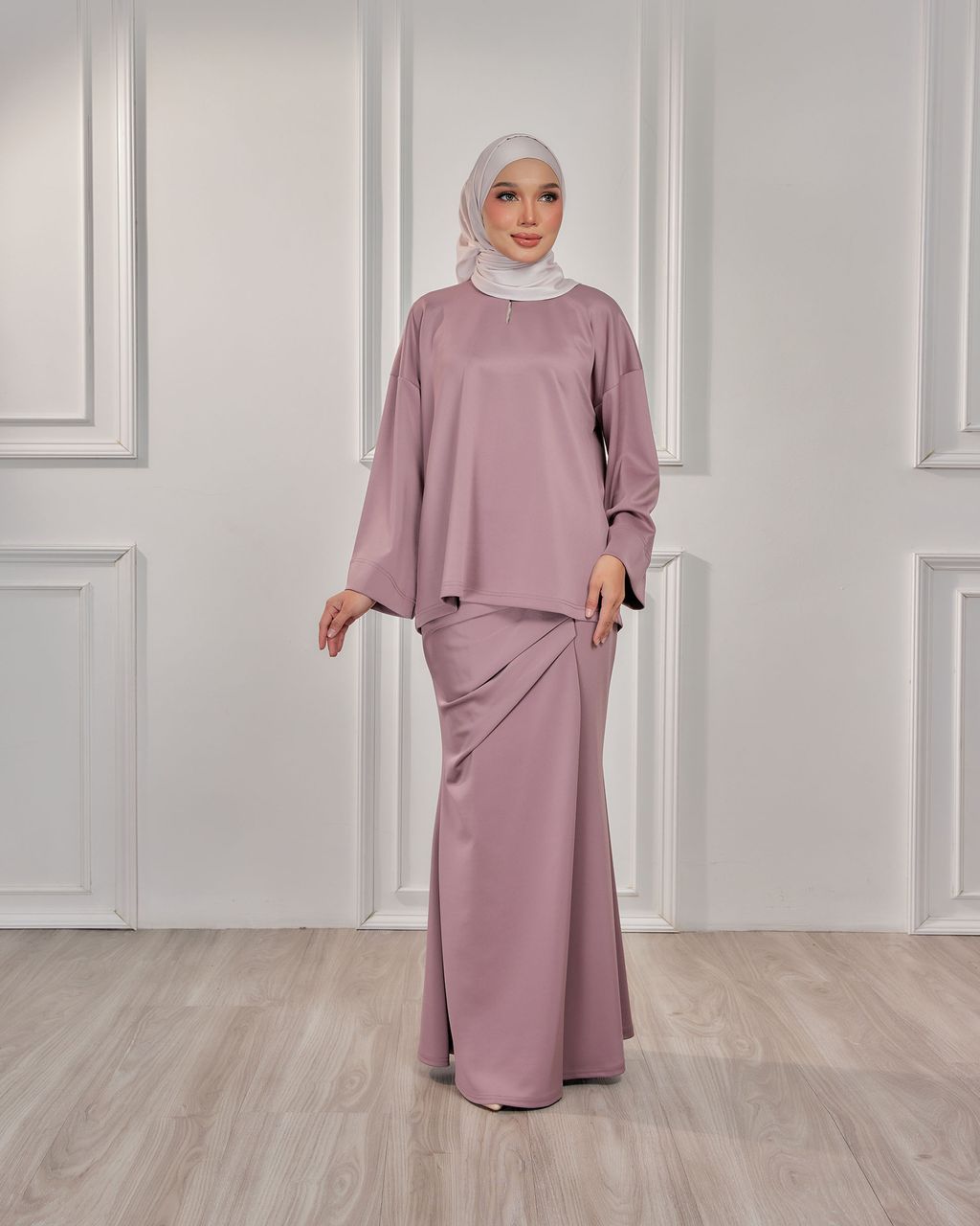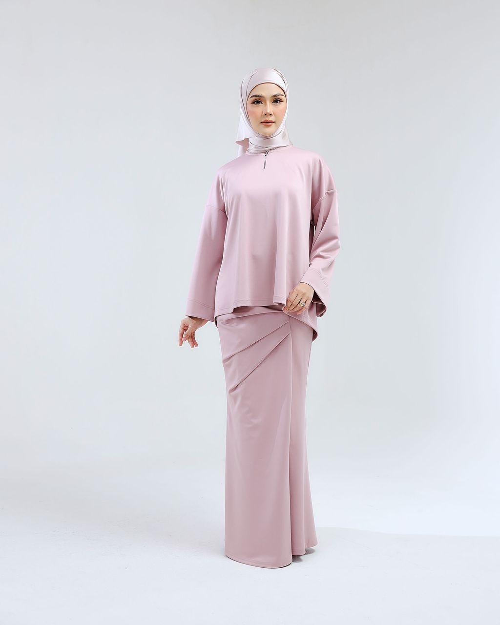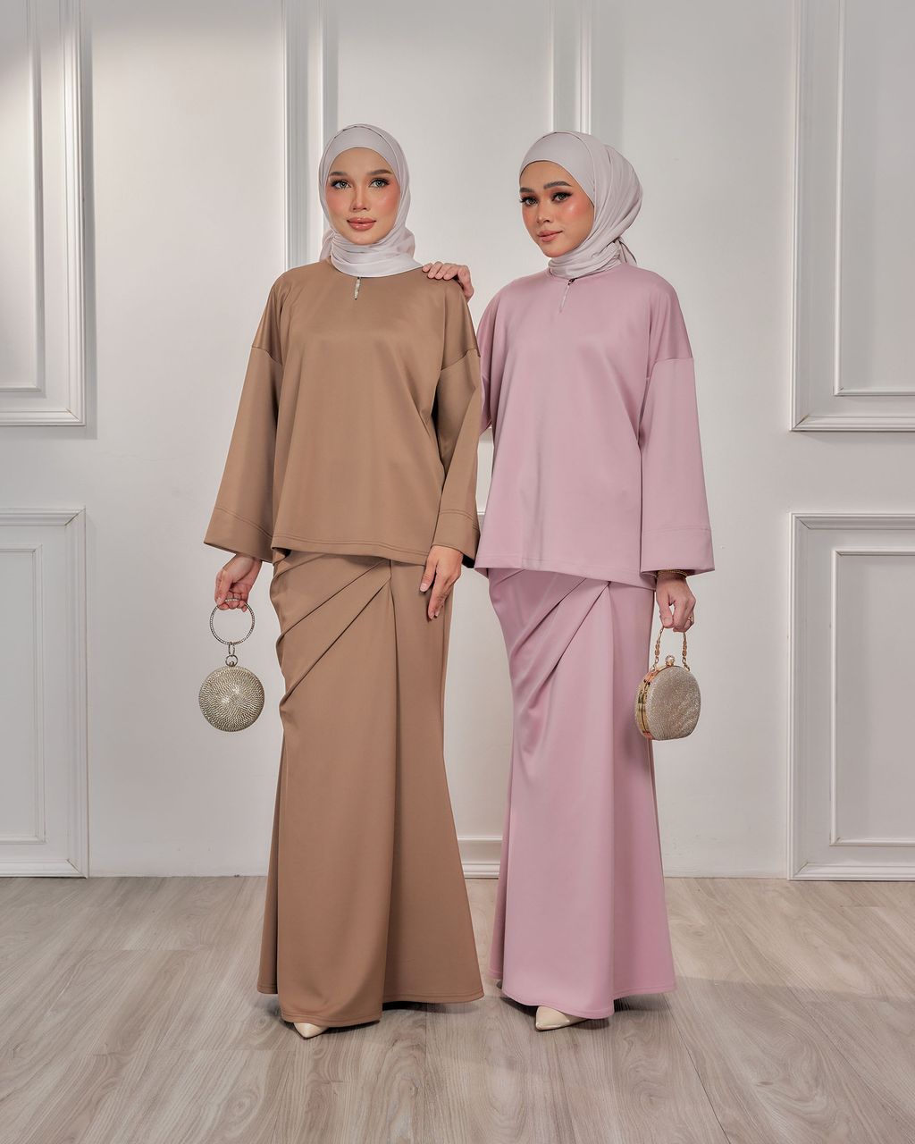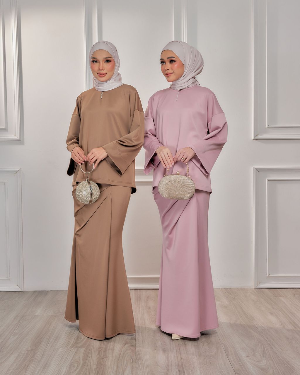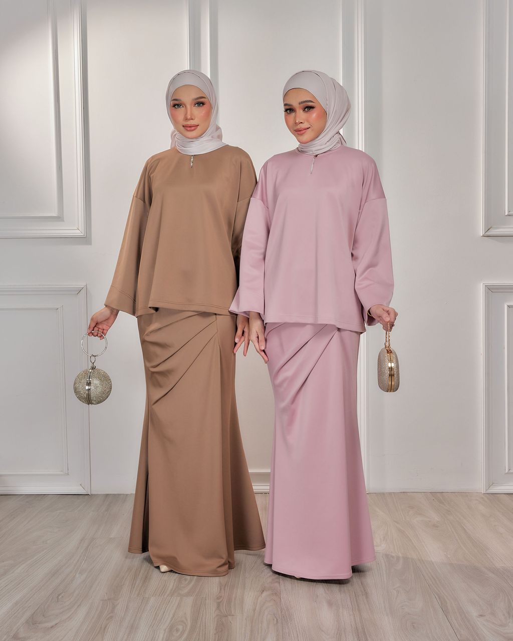 The top is a loose kedah cut top with wide wuduk friendly sleeves design that can even be easily pulled up for breastfeeding and comfortably loose enough for preggy mommy. Thus, the unique cut instant pleated skirt design gives a stylish look and comfortably easy to move without showing off your feet.
