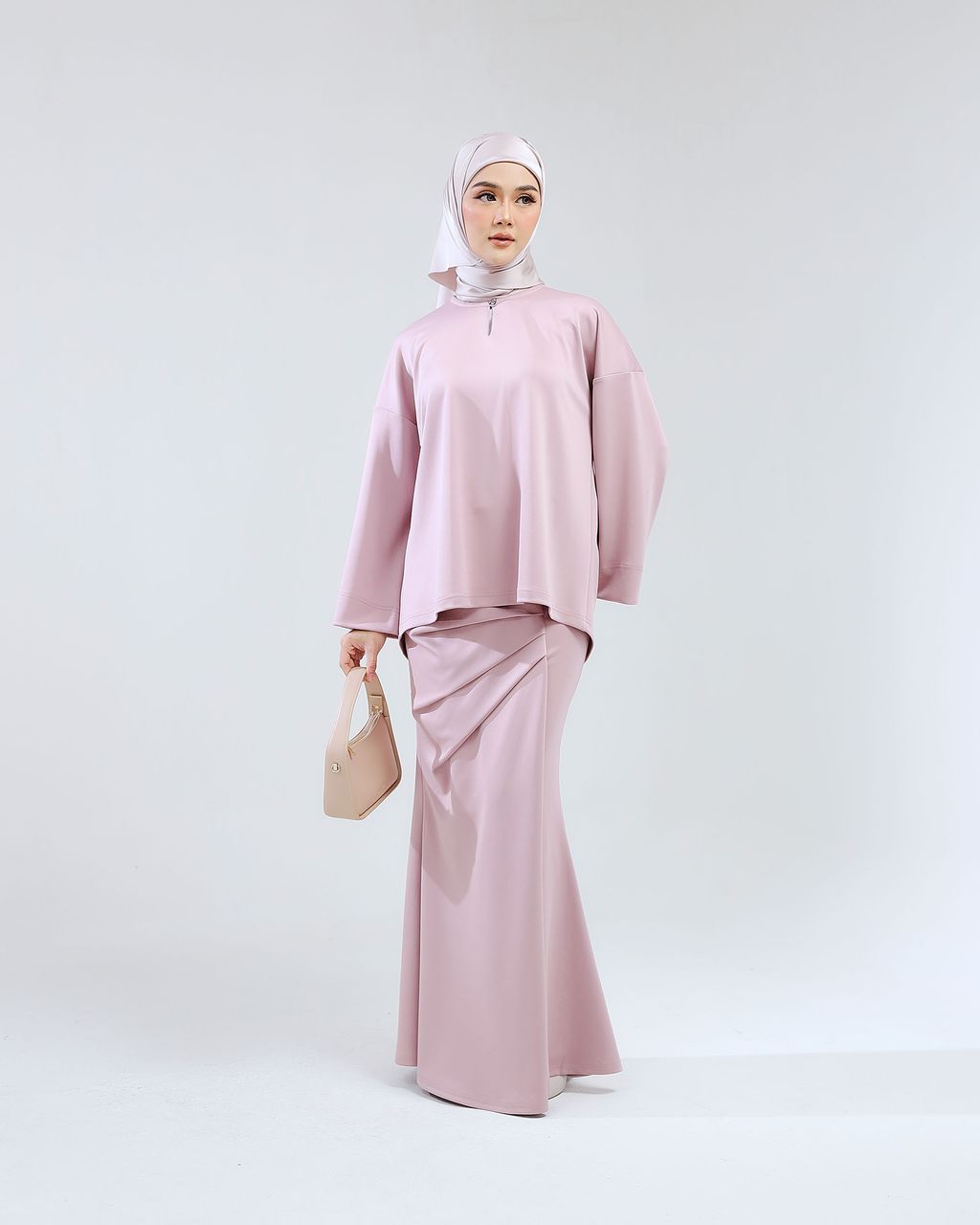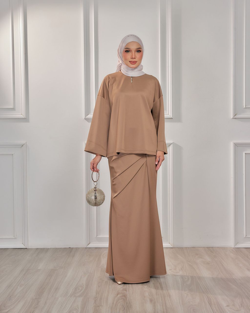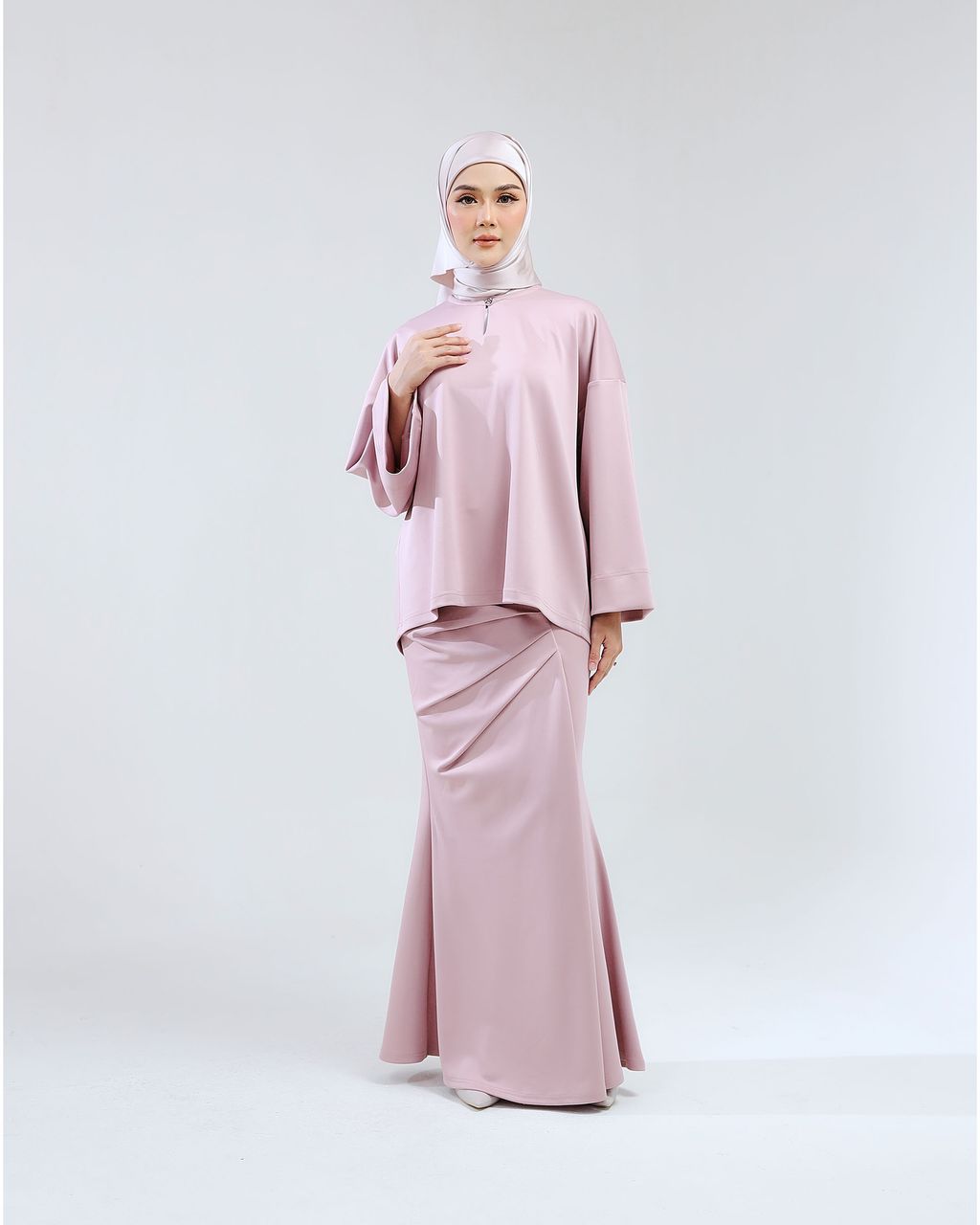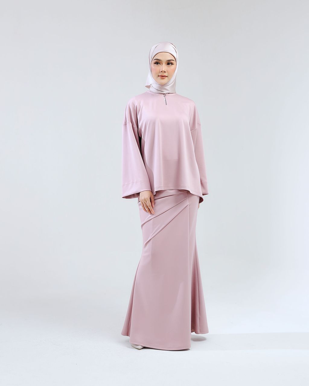 The top is a loose kedah cut top with wide wuduk friendly sleeves design that can even be easily pulled up for breastfeeding and comfortably loose enough for preggy mommy. Thus, the unique cut instant pleated skirt design gives a stylish look and comfortably easy to move without showing off your feet.