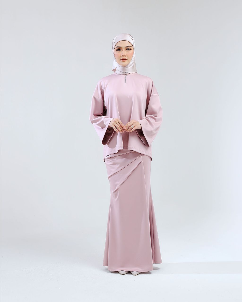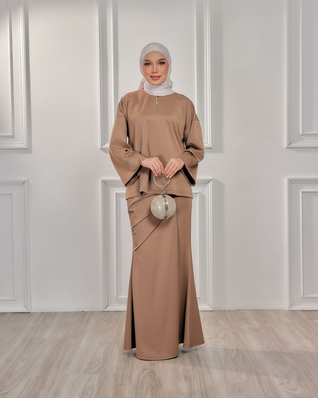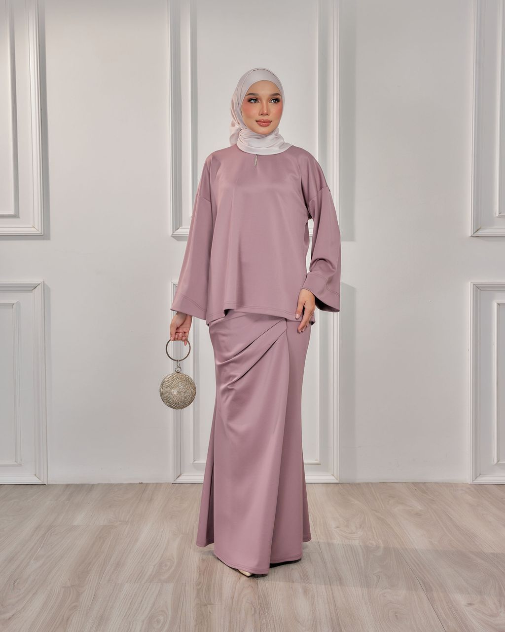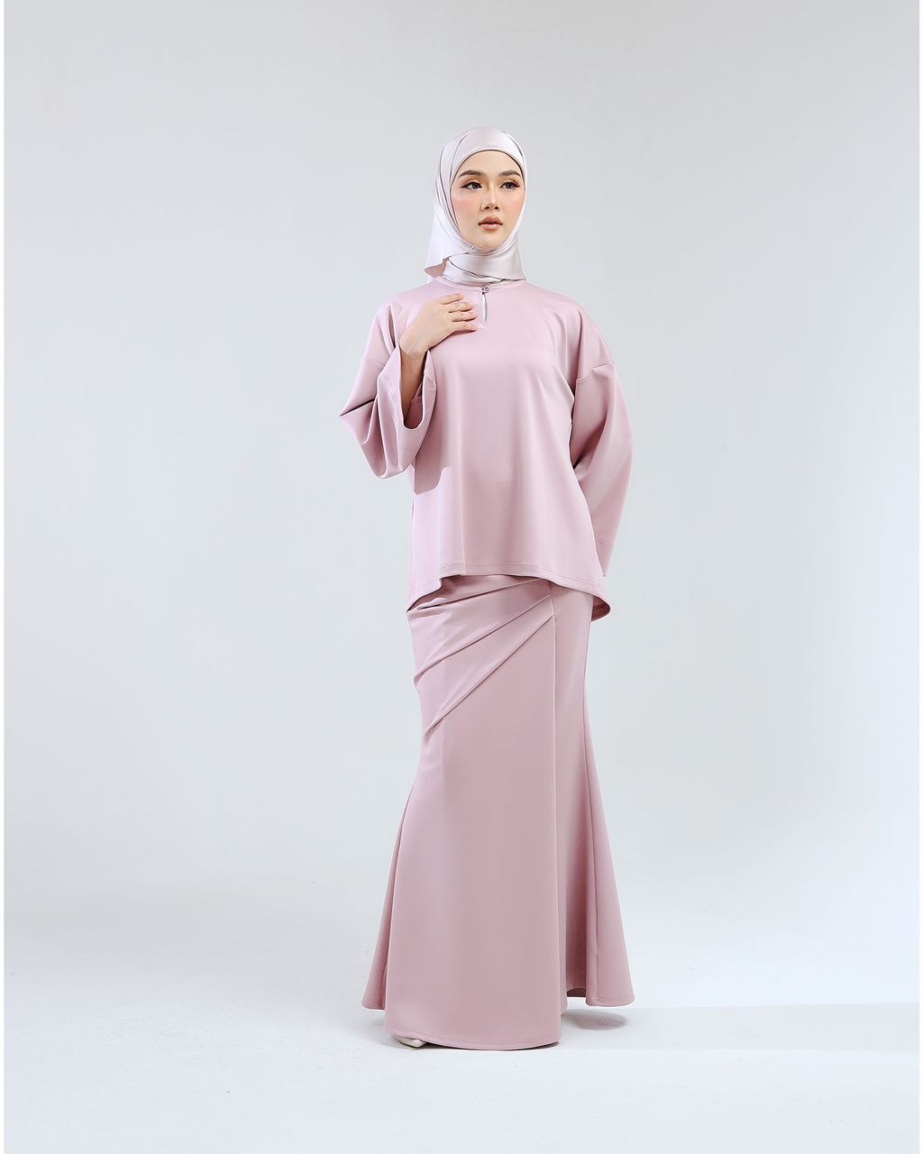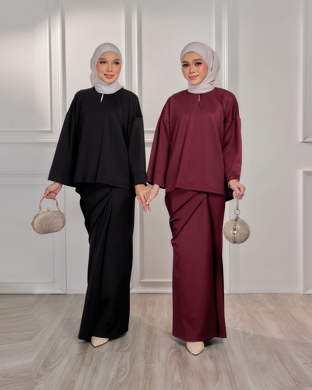 The top is a loose kedah cut top with wide wuduk friendly sleeves design that can even be easily pulled up for breastfeeding and comfortably loose enough for preggy mommy. Thus, the unique cut instant pleated skirt design gives a stylish look and comfortably easy to move without showing off your feet.