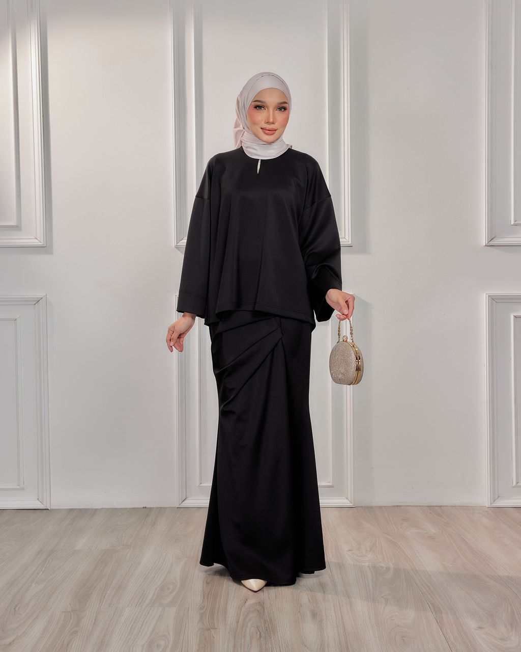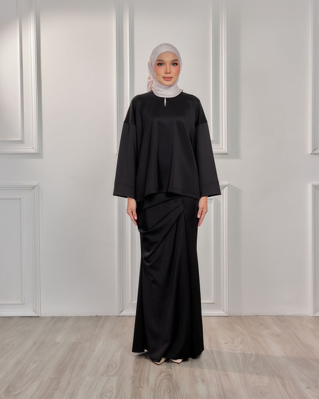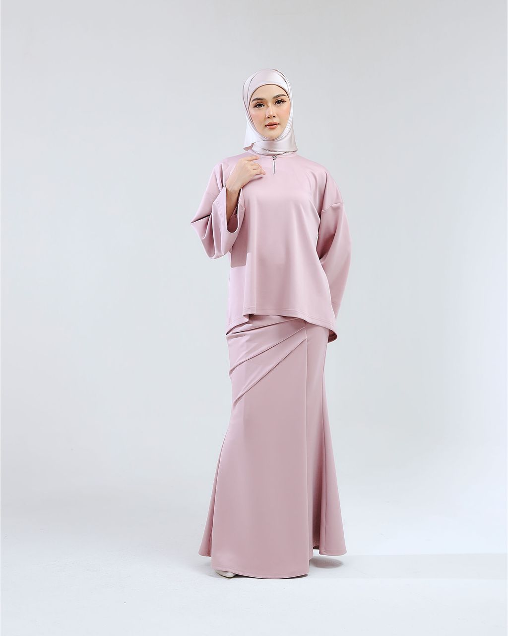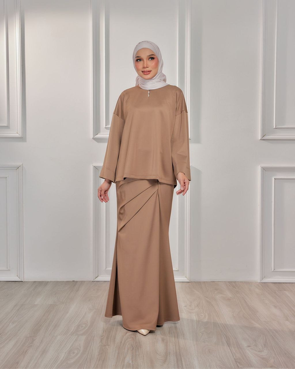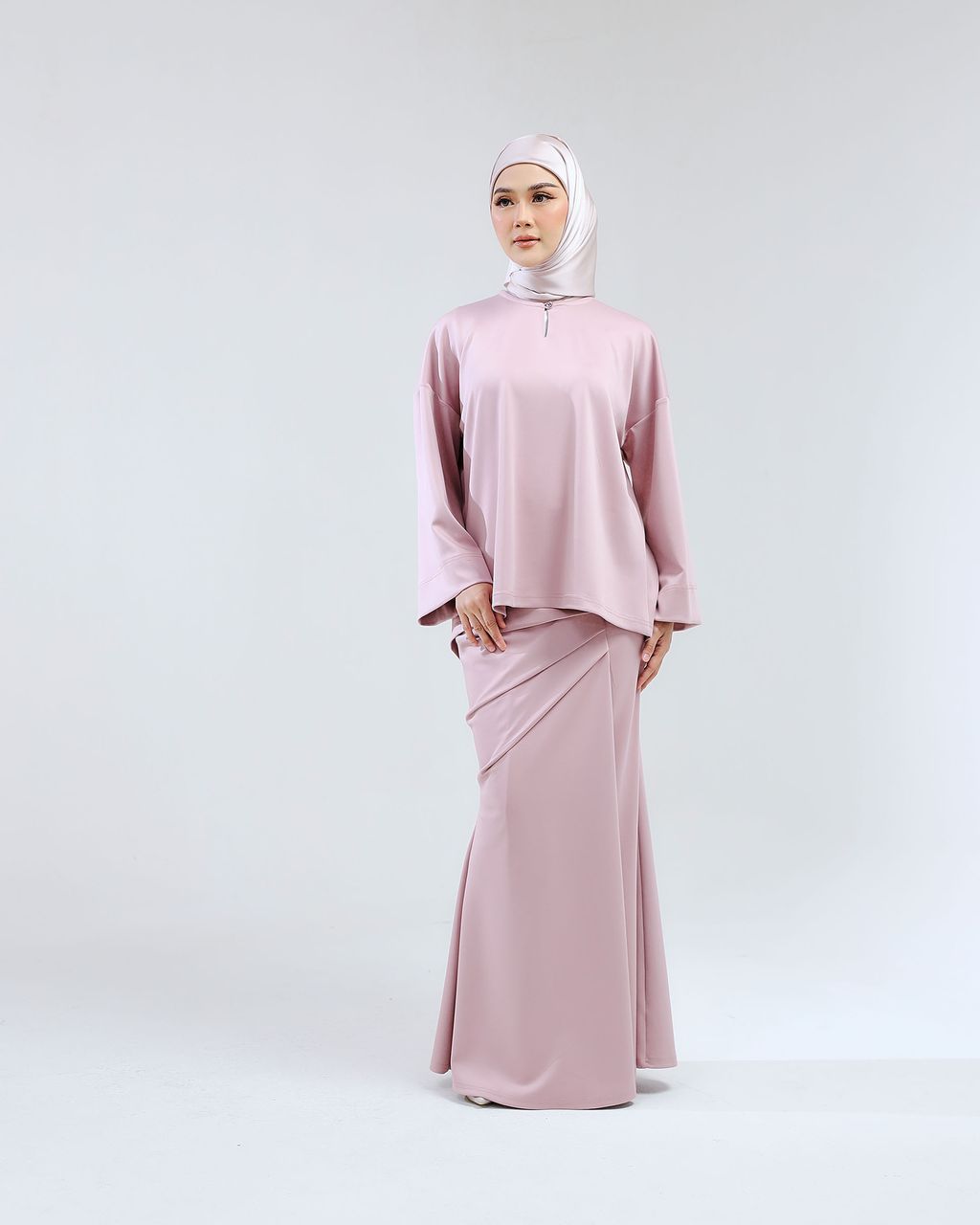 The top is a loose kedah cut top with wide wuduk friendly sleeves design that can even be easily pulled up for breastfeeding and comfortably loose enough for preggy mommy. Thus, the unique cut instant pleated skirt design gives a stylish look and comfortably easy to move without showing off your feet.