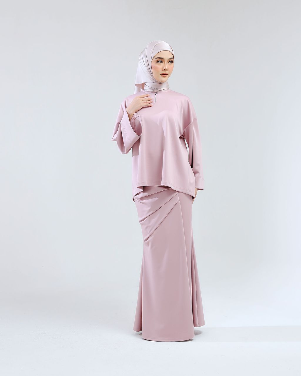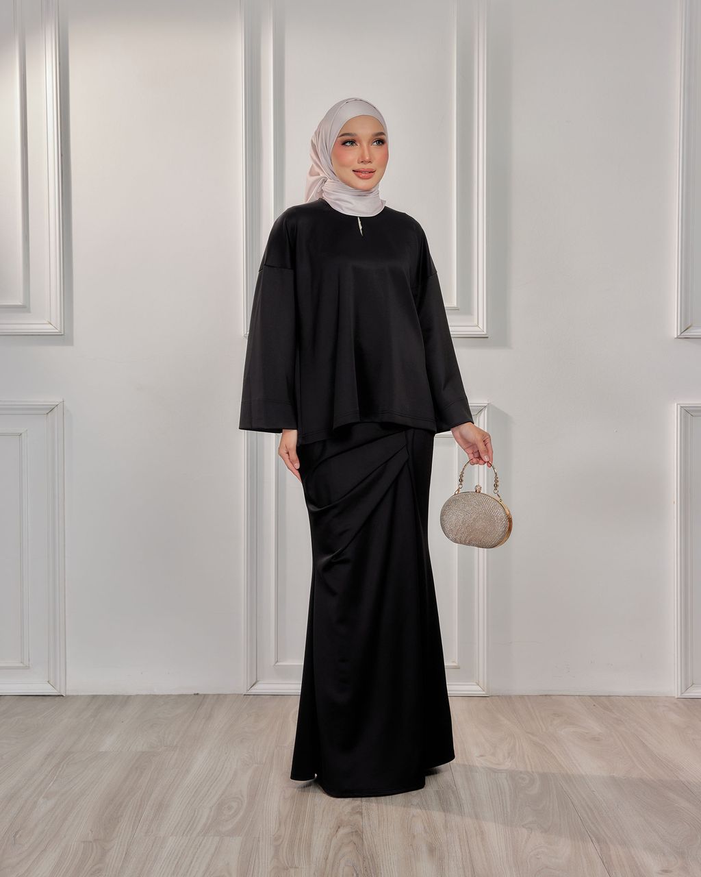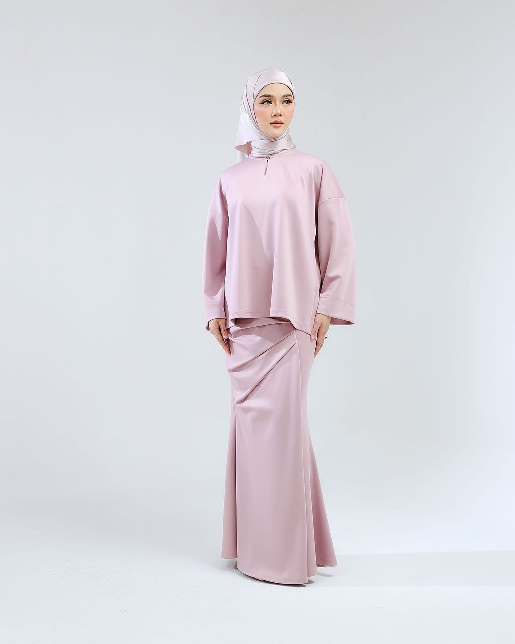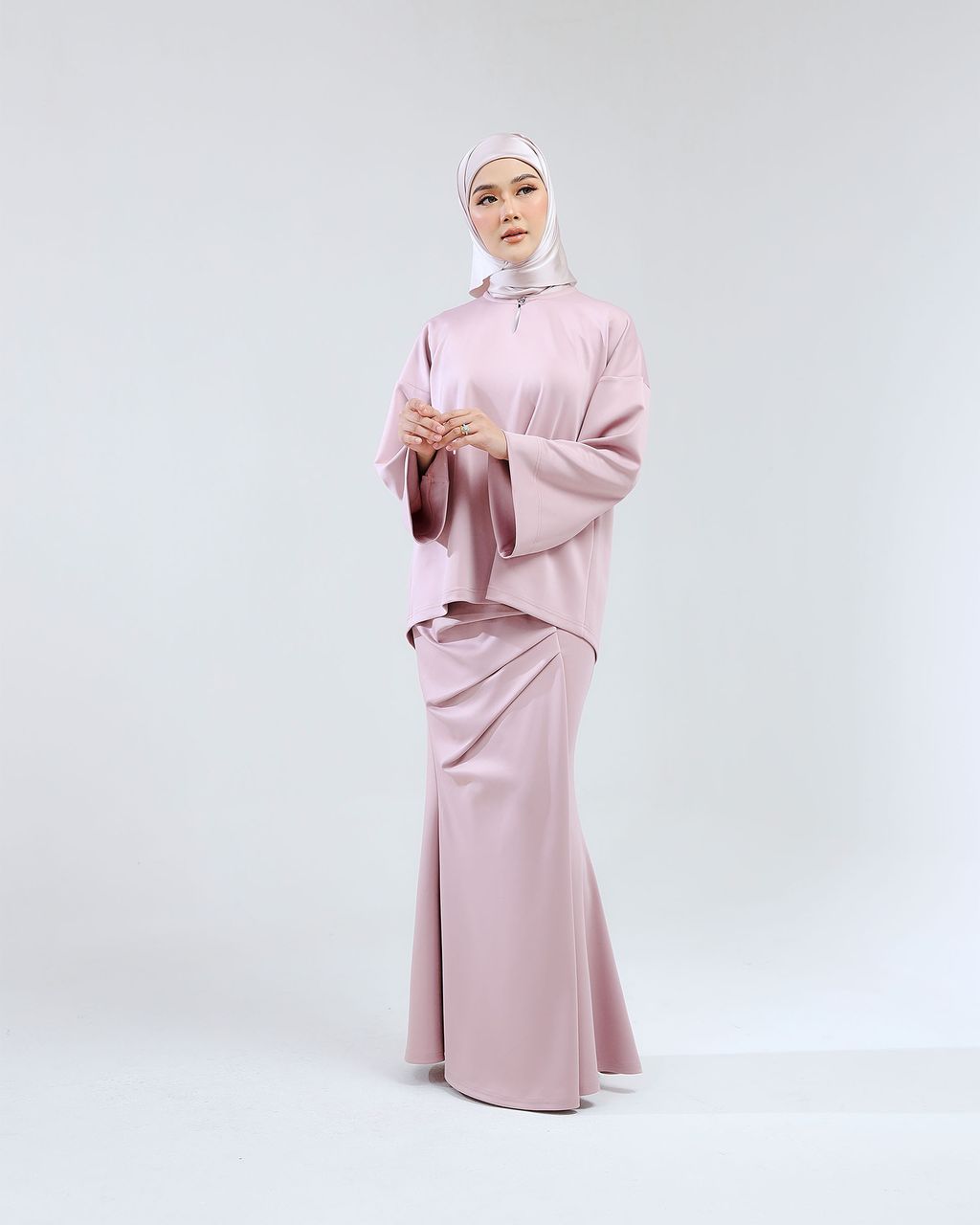The top is a loose kedah cut top with wide wuduk friendly sleeves design that can even be easily pulled up for breastfeeding and comfortably loose enough for preggy mommy. Thus, the unique cut instant pleated skirt design gives a stylish look and comfortably easy to move without showing off your feet.