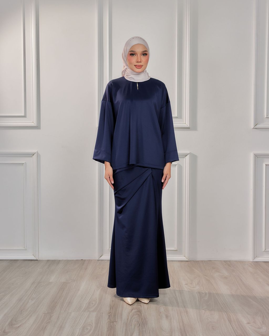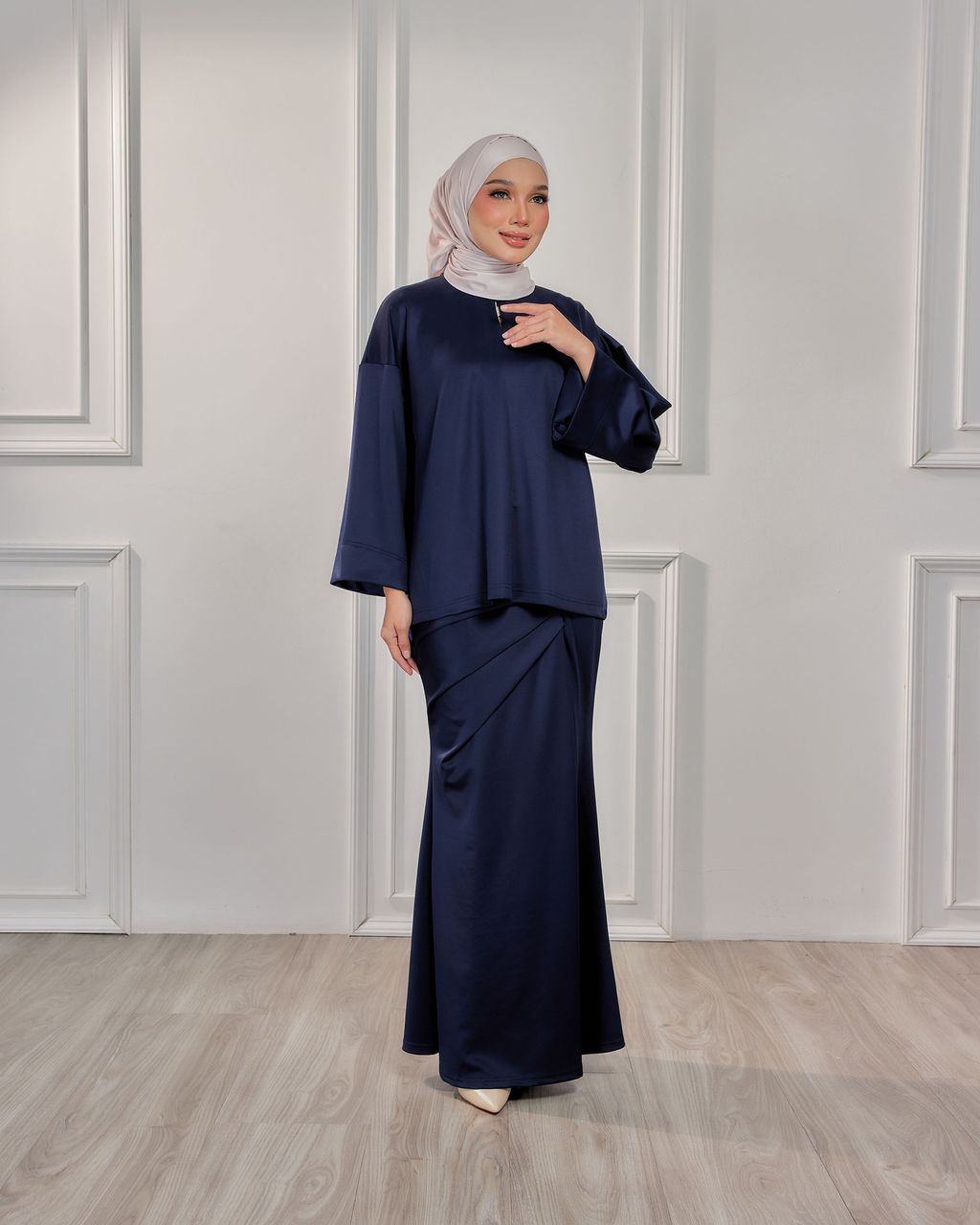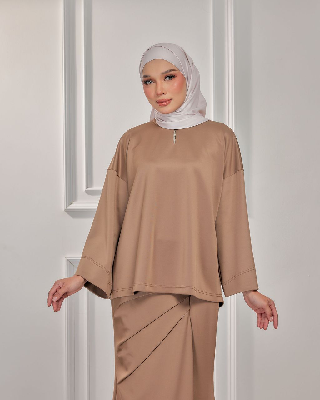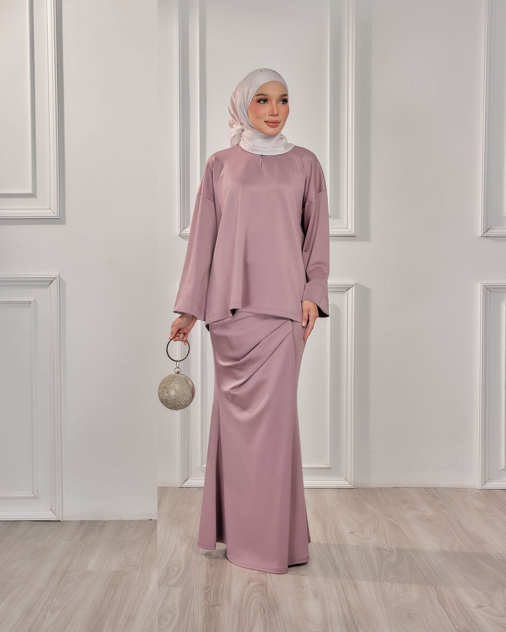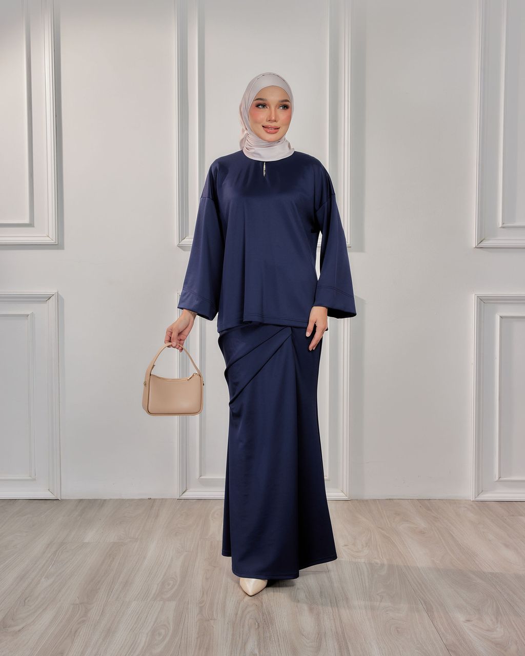 The top is a loose kedah cut top with wide wuduk friendly sleeves design that can even be easily pulled up for breastfeeding and comfortably loose enough for preggy mommy. Thus, the unique cut instant pleated skirt design gives a stylish look and comfortably easy to move without showing off your feet.