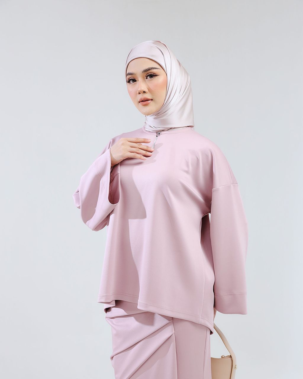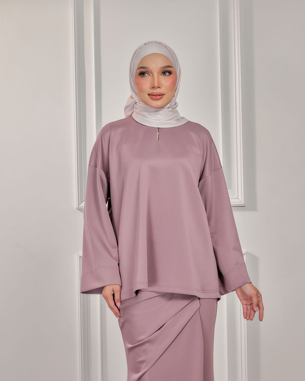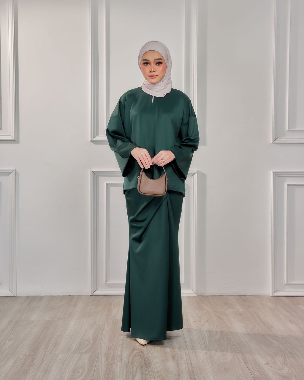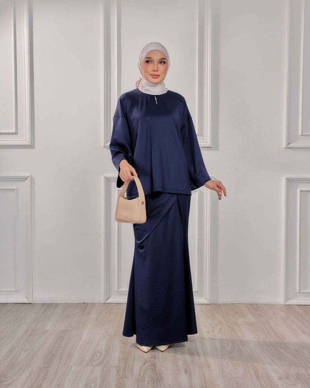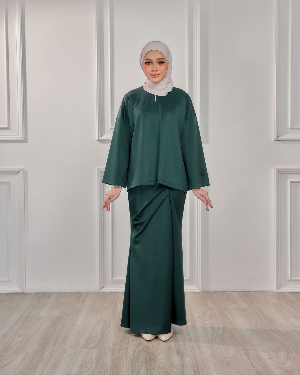 The top is a loose kedah cut top with wide wuduk friendly sleeves design that can even be easily pulled up for breastfeeding and comfortably loose enough for preggy mommy. Thus, the unique cut instant pleated skirt design gives a stylish look and comfortably easy to move without showing off your feet.