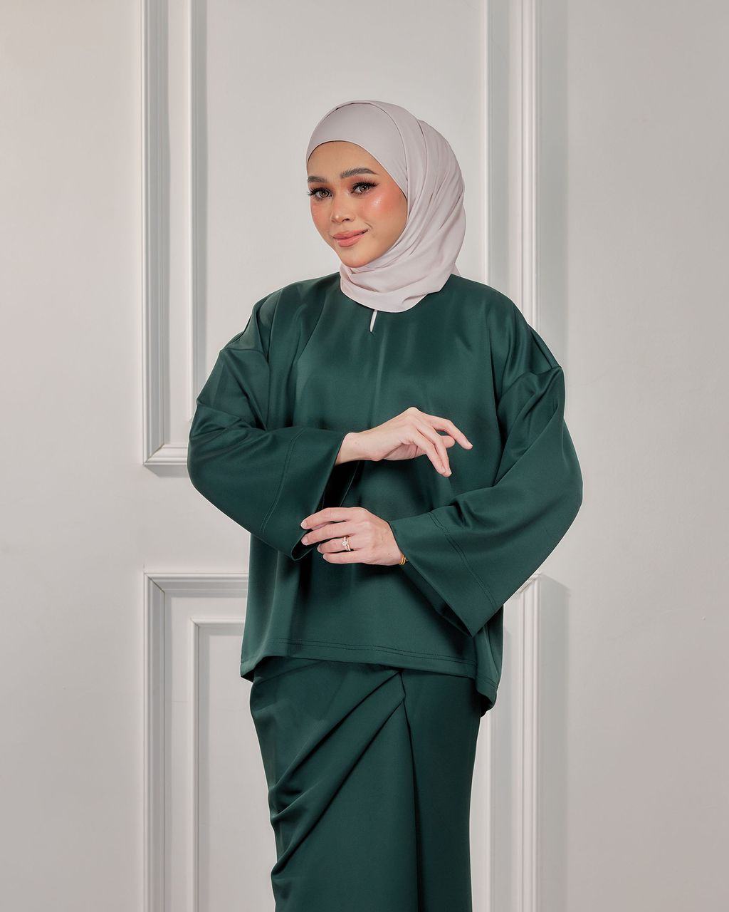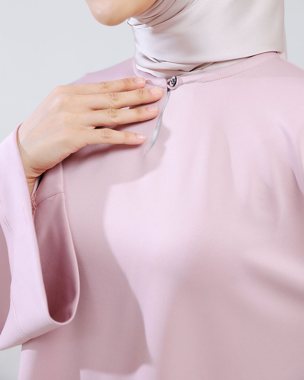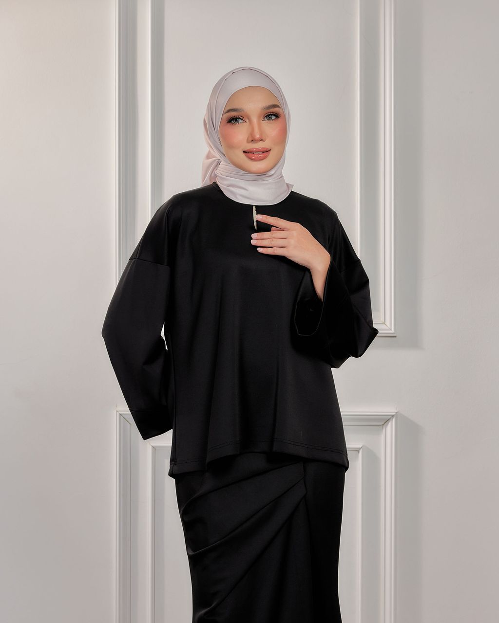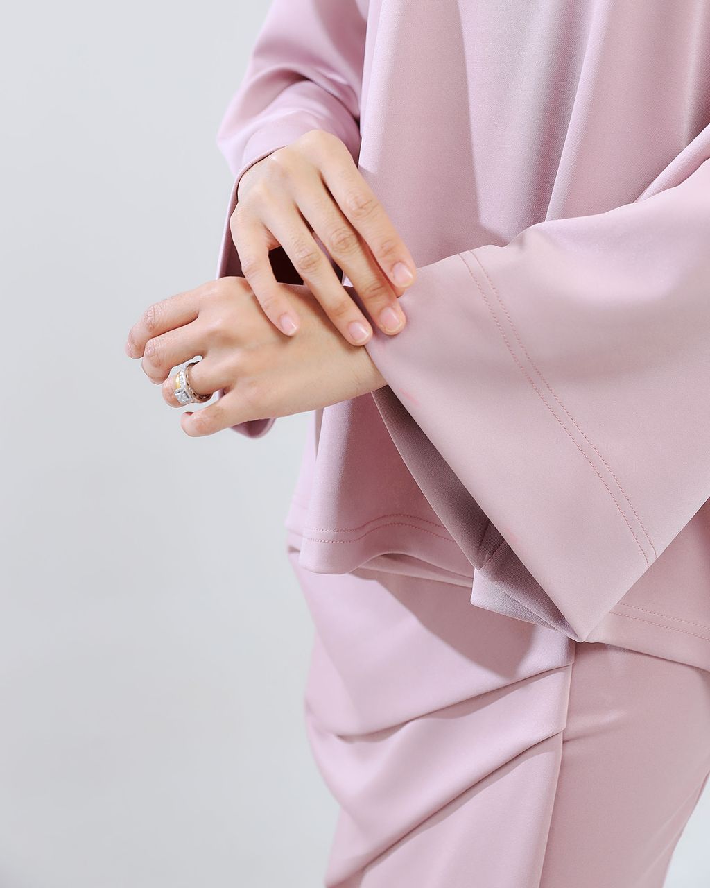 The top is a loose kedah cut top with wide wuduk friendly sleeves design that can even be easily pulled up for breastfeeding and comfortably loose enough for preggy mommy. Thus, the unique cut instant pleated skirt design gives a stylish look and comfortably easy to move without showing off your feet.
