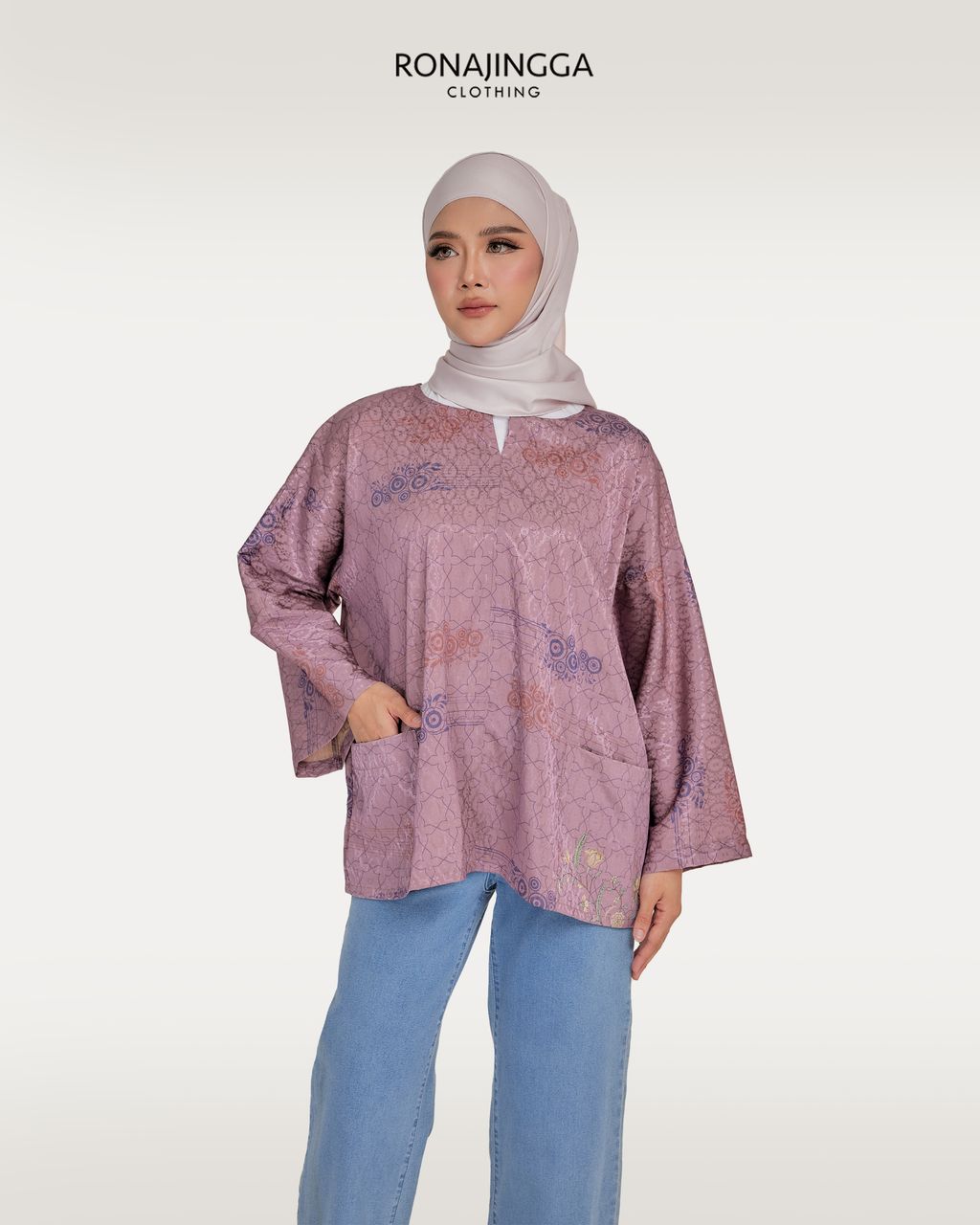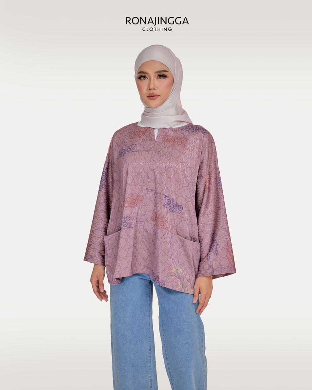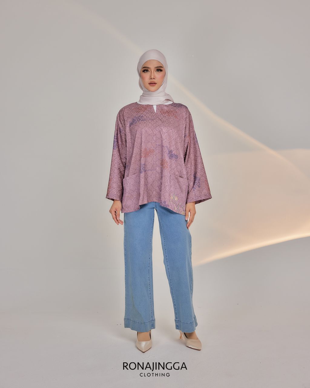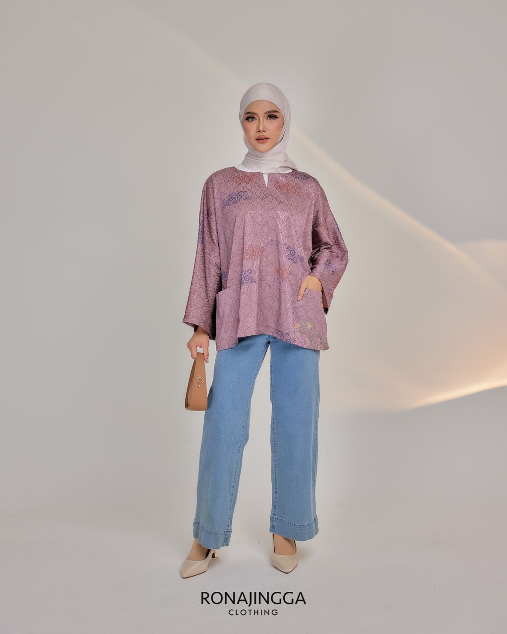 A premium super comfortable loose kedah cut top with 2 front pockets made from High Quality Premium Printed dobby & jacquard Silk that fits nicely on any body shape. The sleeves are wuduk' and dish washing friendly . It is a loose fit blouse that can be easily pulled up for breastfeeding / be worn as maternity wear.
