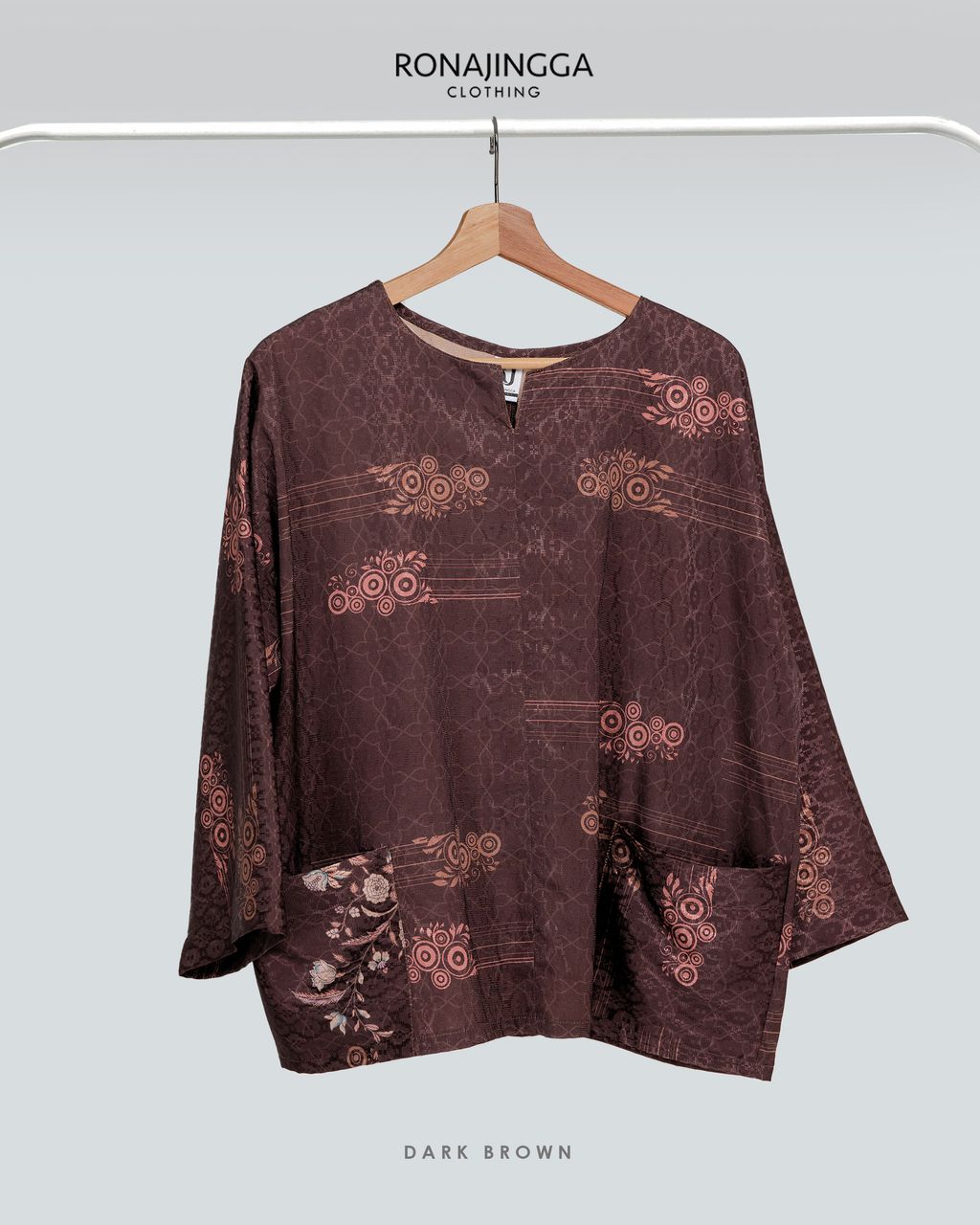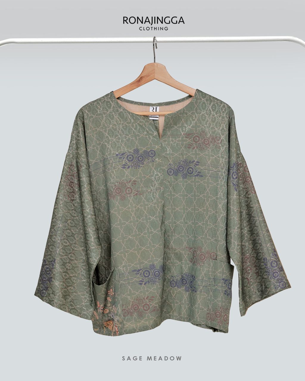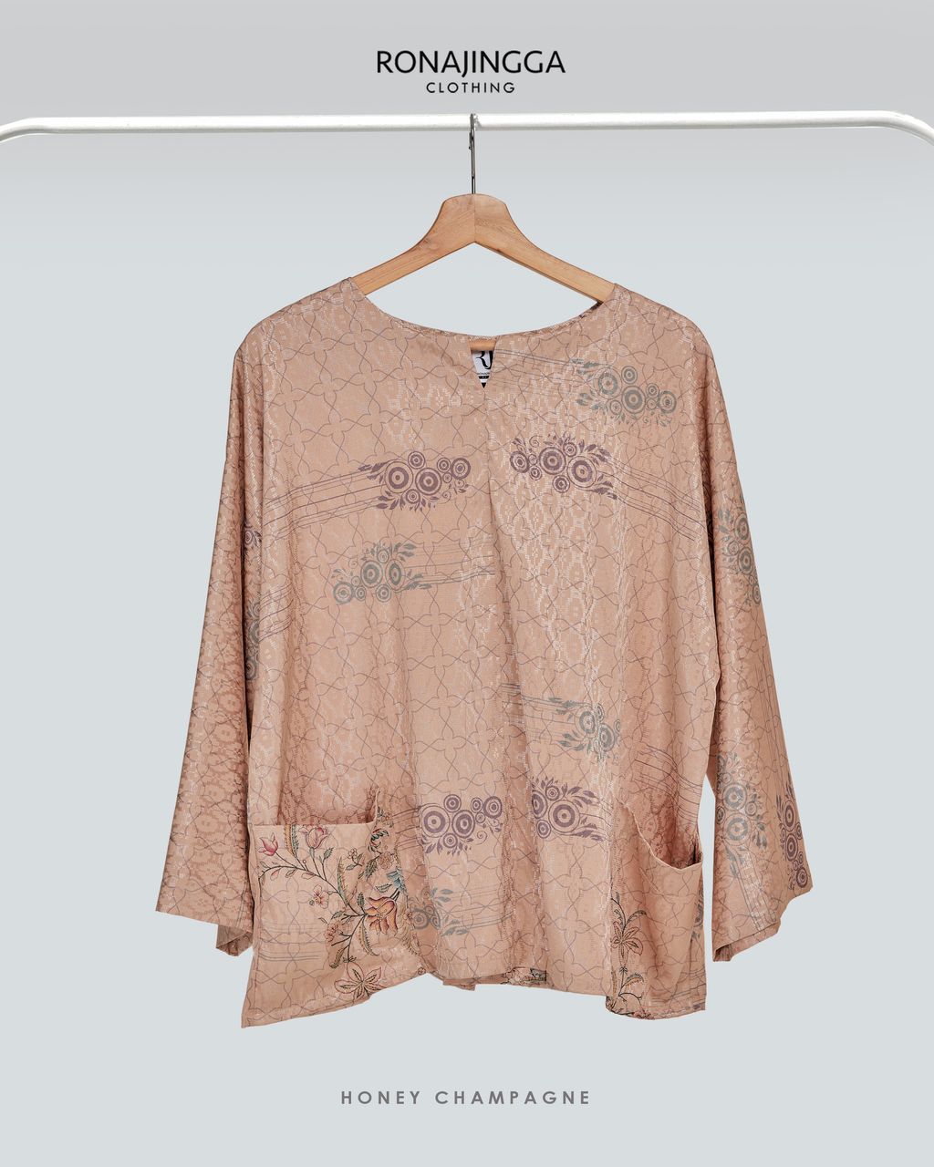 A premium super comfortable loose kedah cut top with 2 front pockets made from High Quality Premium Printed dobby & jacquard Silk that fits nicely on any body shape. The sleeves are wuduk' and dish washing friendly . It is a loose fit blouse that can be easily pulled up for breastfeeding / be worn as maternity wear.