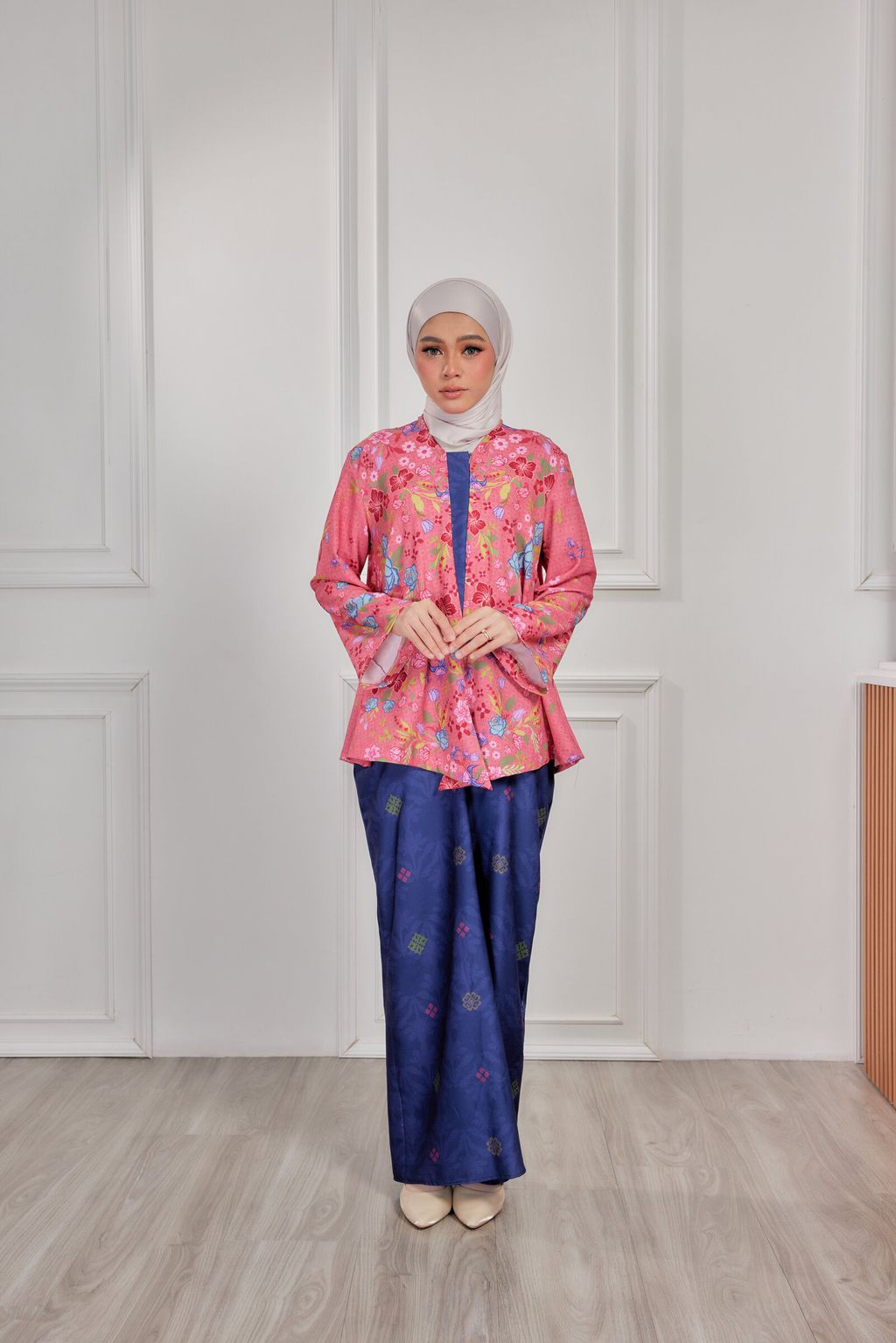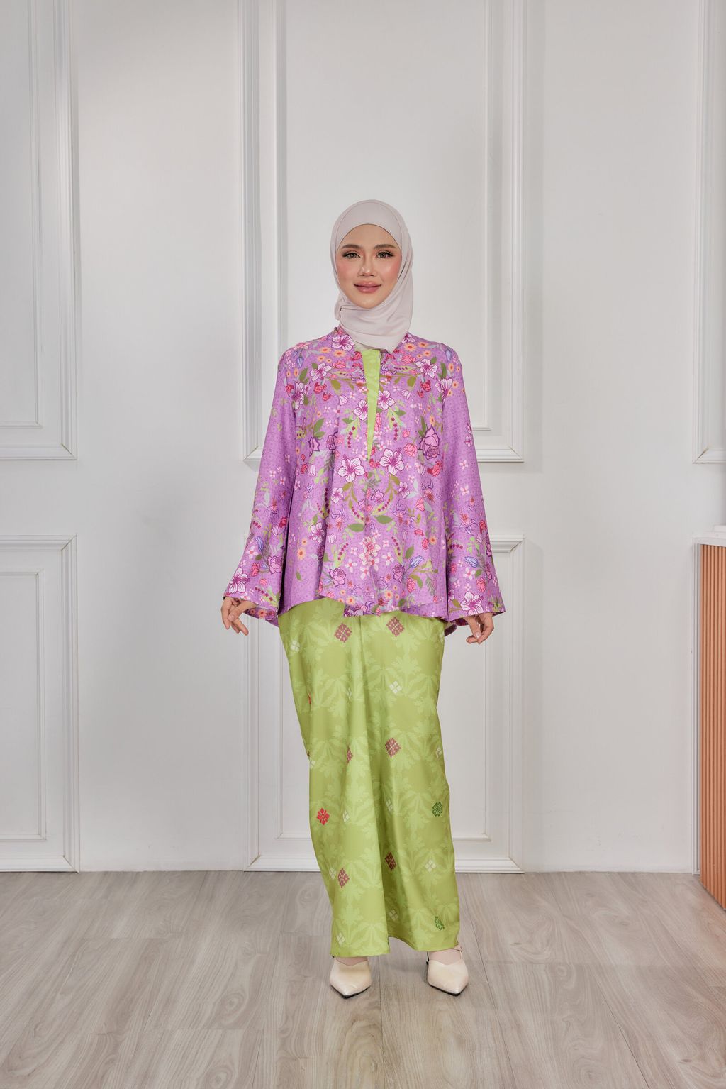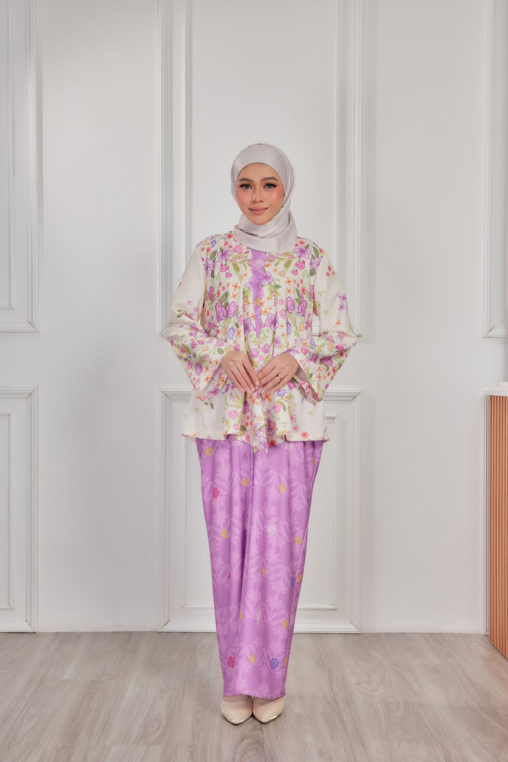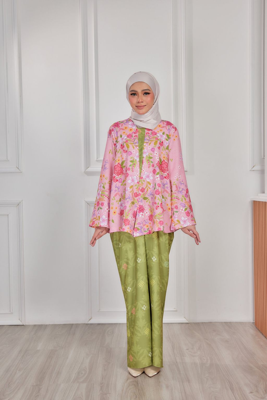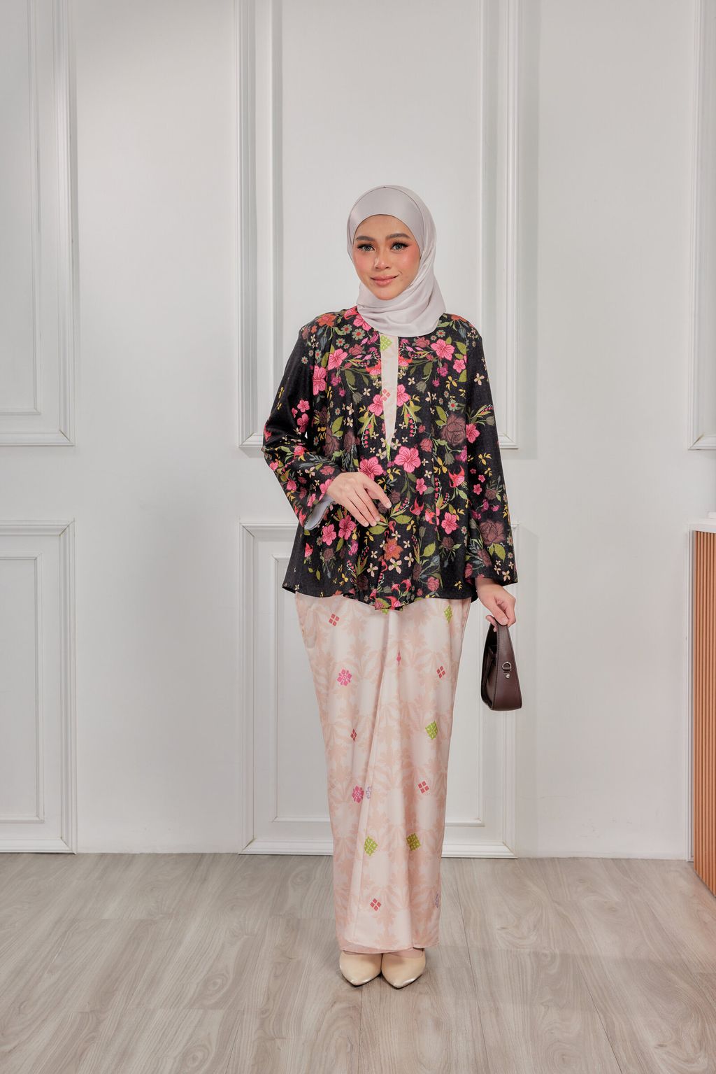 It is a loose, elegant and minimal baggy kebaya made from High Quality Premium Iron-less Soft Italian Crepe with wuduk friendly wide sleeves design , that fits nicely on any body shape and cooling to wear from day to night. The top is a loose baggy top that can even be easily pulled up for breastfeeding and comfortably loose enough for preggy mommy.