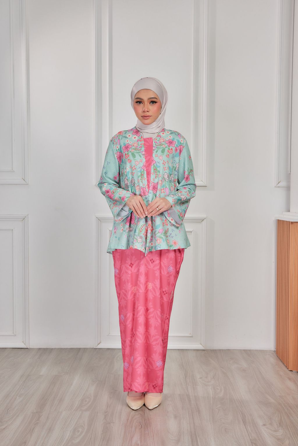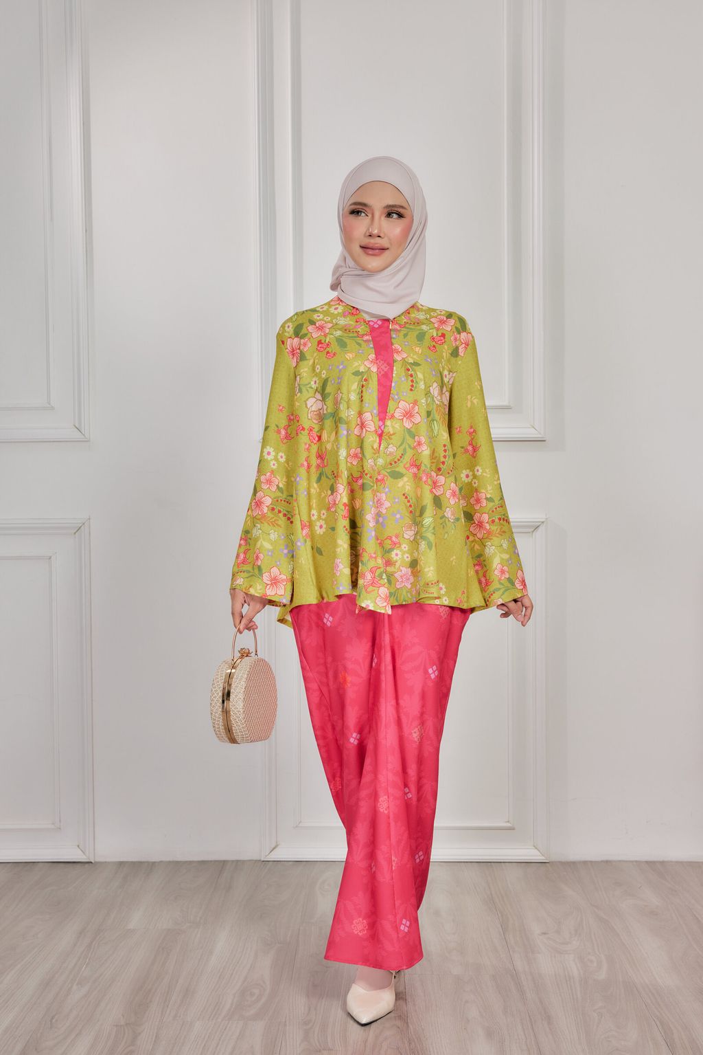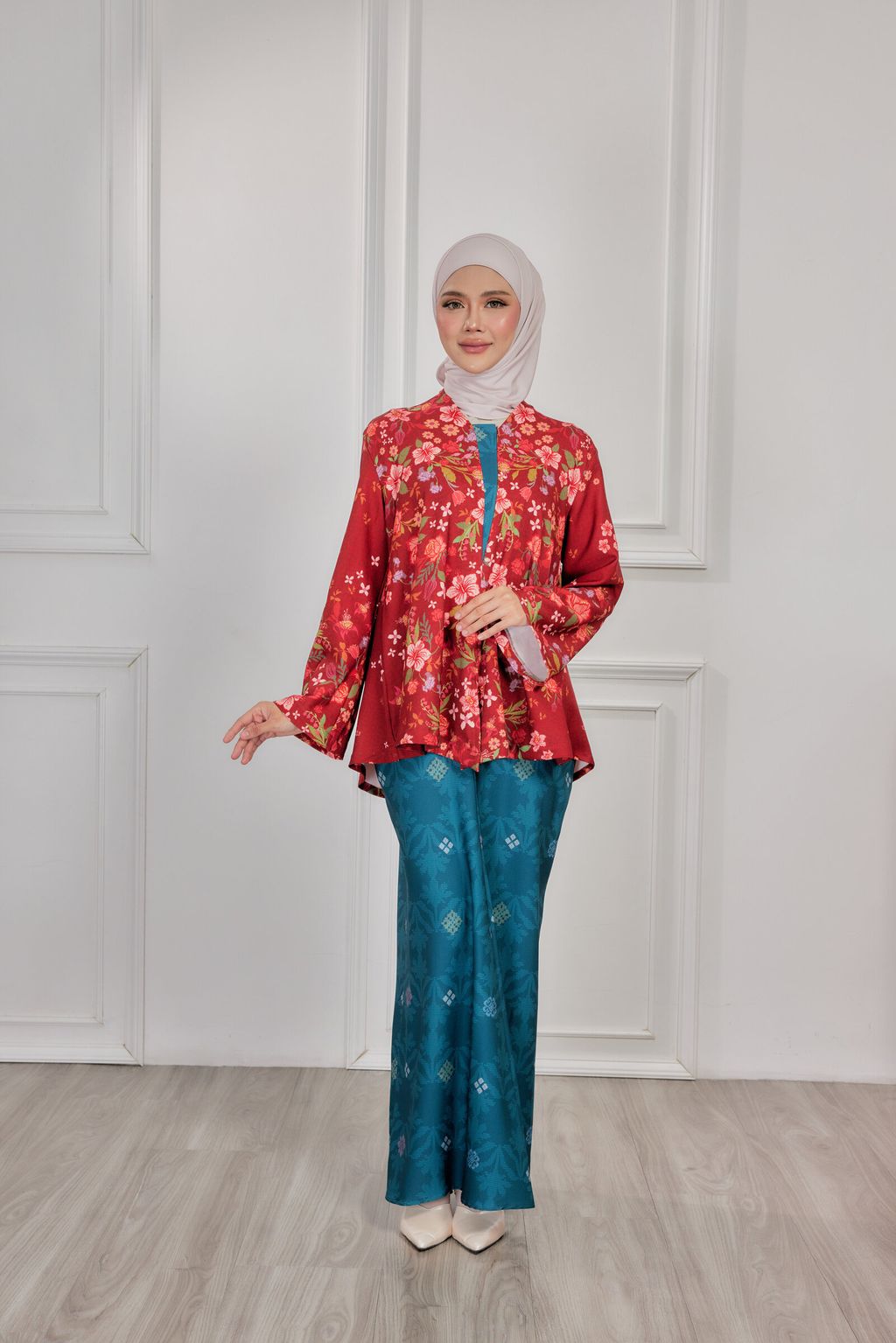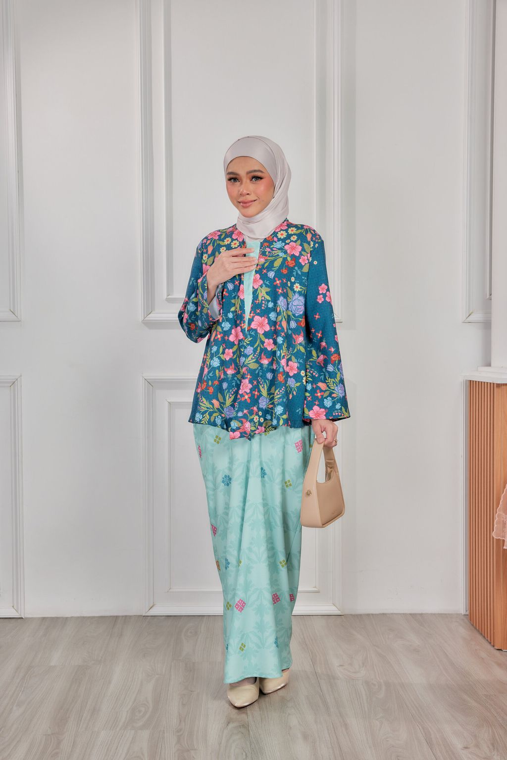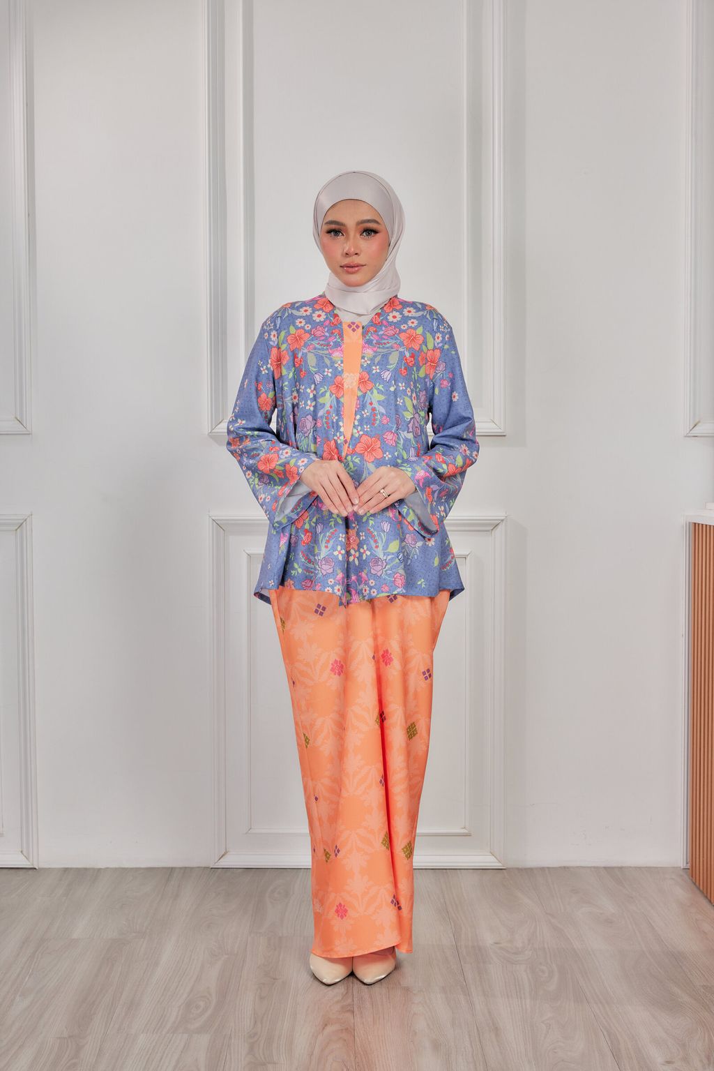 It is a loose, elegant and minimal baggy kebaya made from High Quality Premium Iron-less Soft Italian Crepe with wuduk friendly wide sleeves design , that fits nicely on any body shape and cooling to wear from day to night. The top is a loose baggy top that can even be easily pulled up for breastfeeding and comfortably loose enough for preggy mommy.
