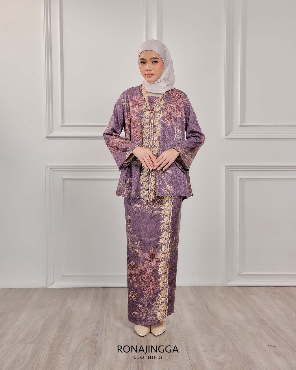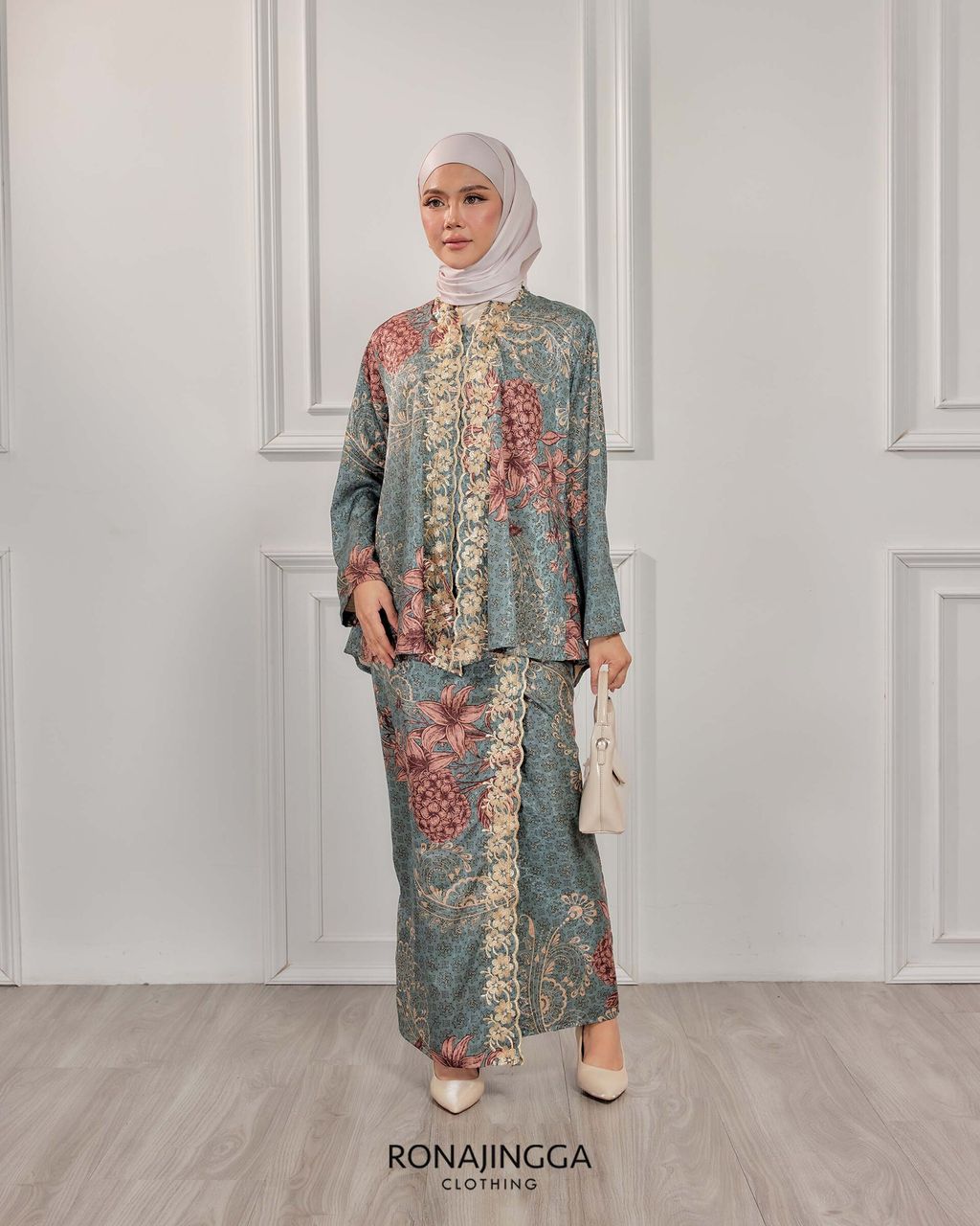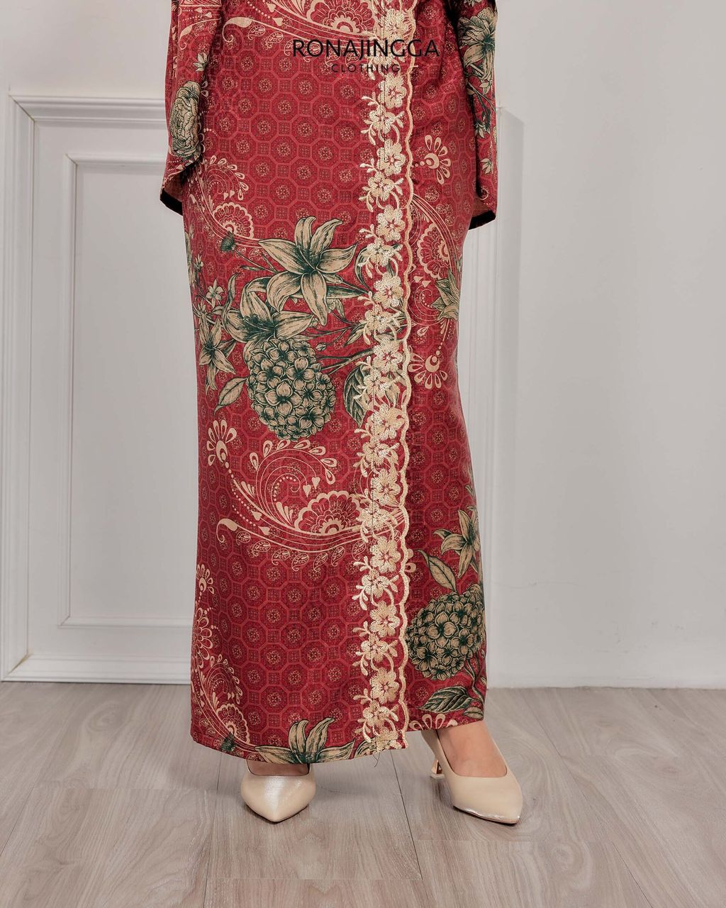It is a Minimal kebaya made from Ironless High Quality Premium Printed Embroidered Dobby Silk that is Soft, Cooling & Flowy. It fits nicely on any body shape and super comfy to wear from day to night. Thus, the beautifully cut front overlap skirt (kain selisih) with Emboridery that gives a stylish look and comfortably easy to move without showing off your feet.