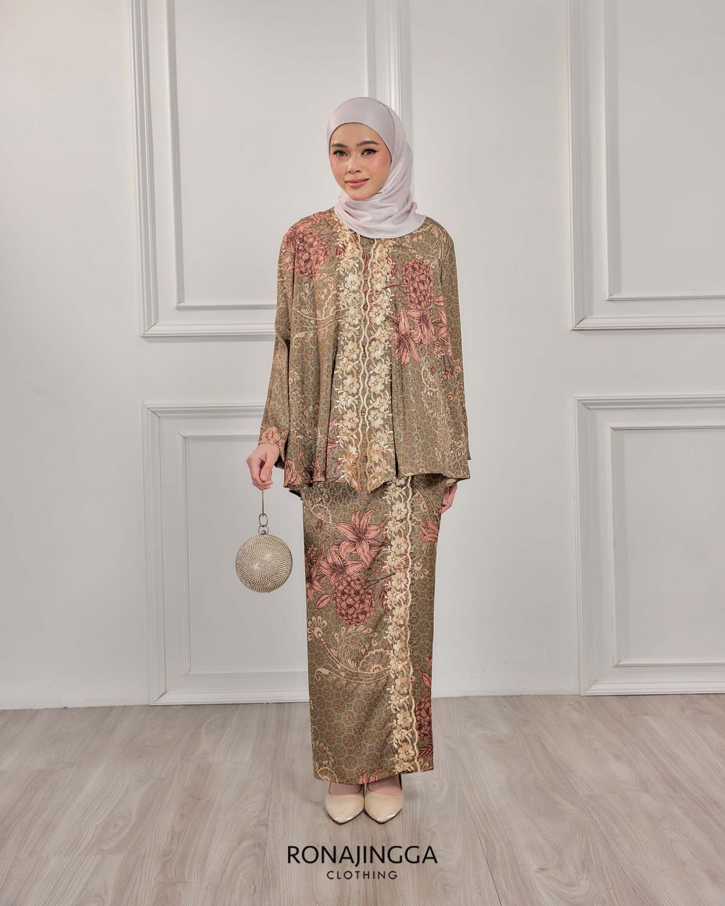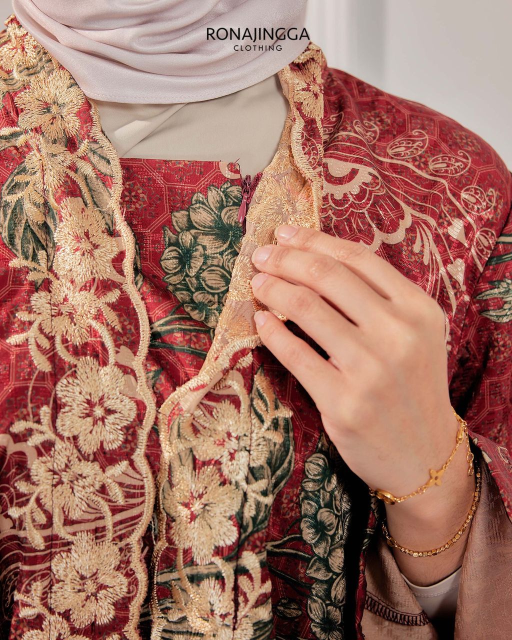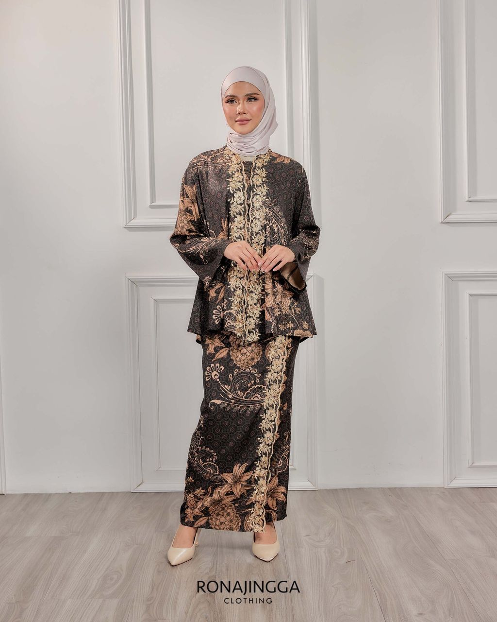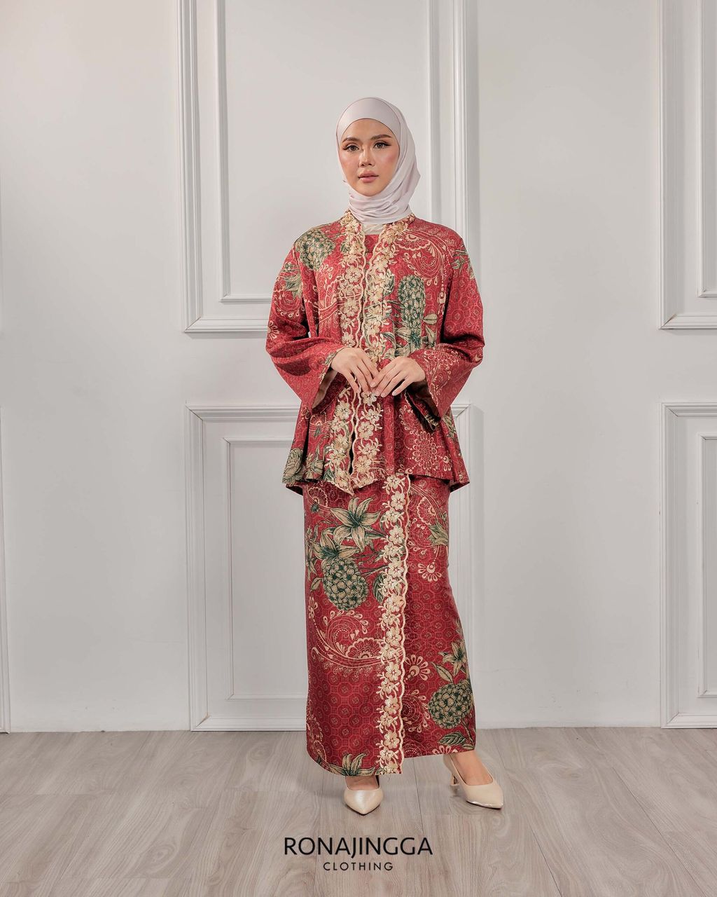 It is a Minimal kebaya made from Ironless High Quality Premium Printed Embroidered Dobby Silk that is Soft, Cooling & Flowy. It fits nicely on any body shape and super comfy to wear from day to night. Thus, the beautifully cut front overlap skirt (kain selisih) with Emboridery that gives a stylish look and comfortably easy to move without showing off your feet.