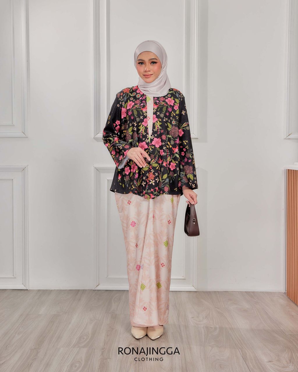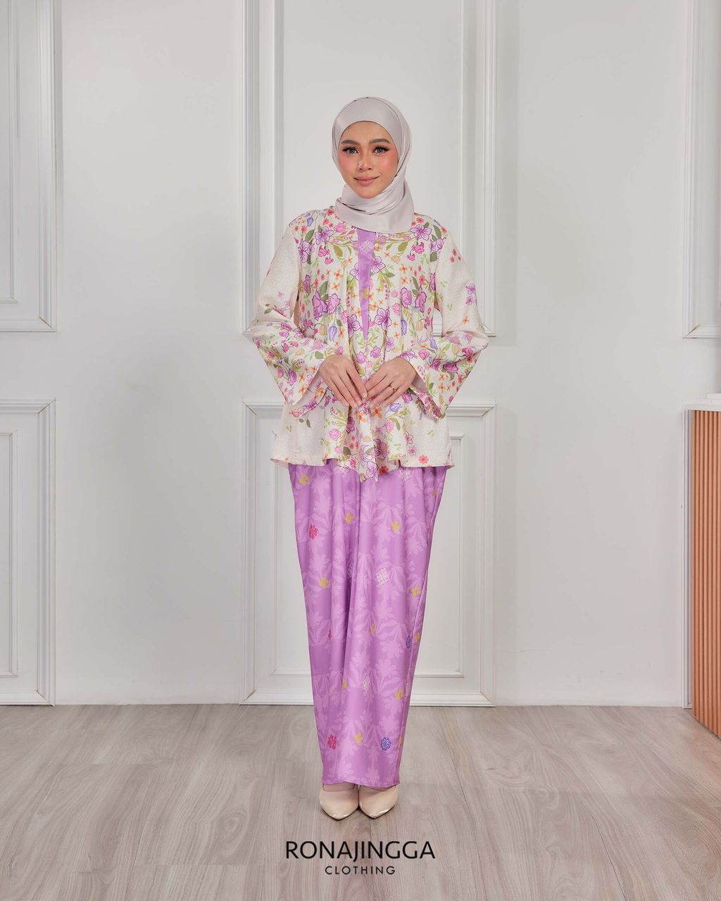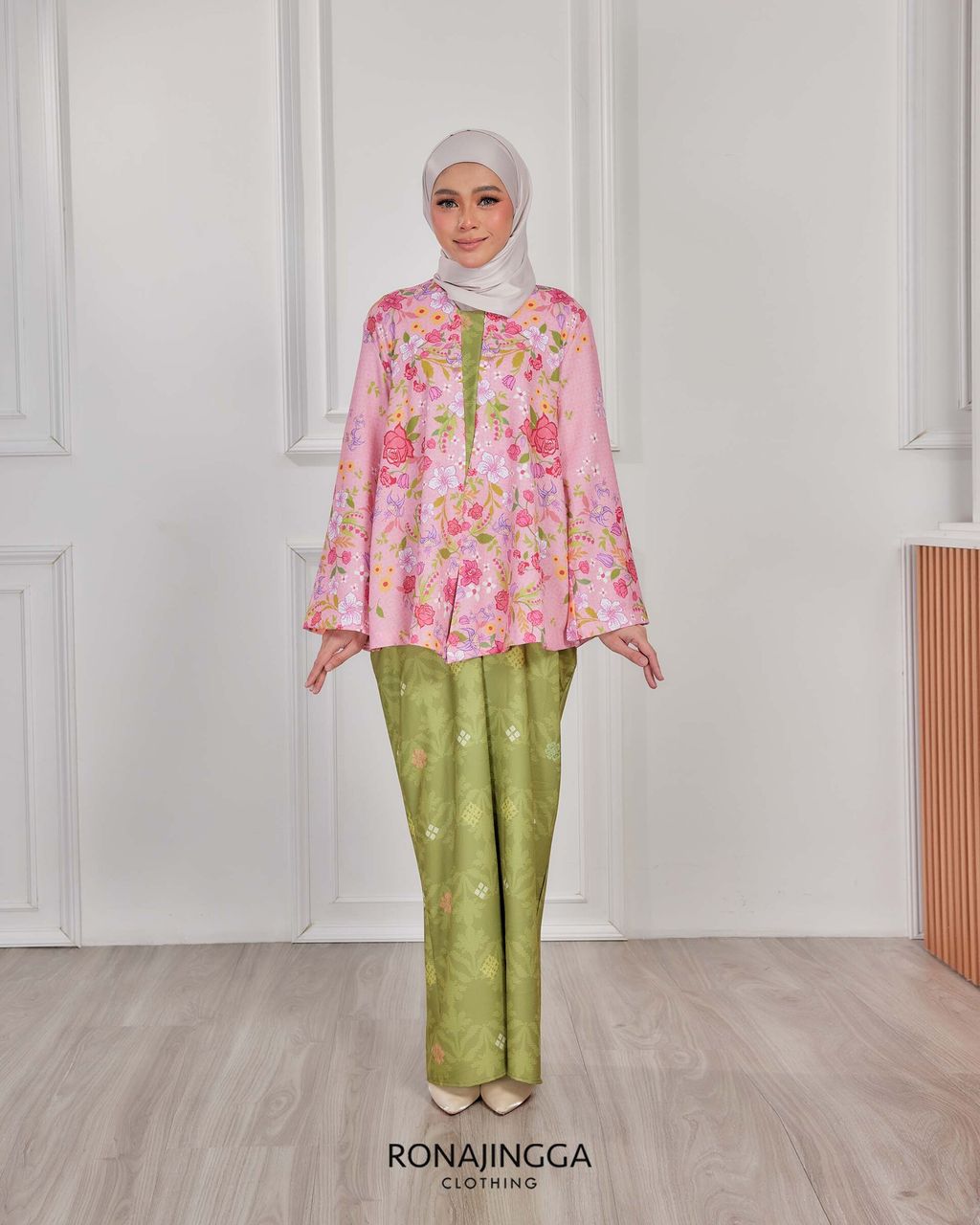 It is a loose, elegant and minimal baggy kebaya made from High Quality Premium Iron-less Soft Italian Crepe with wuduk friendly wide sleeves design , that fits nicely on any body shape and cooling to wear from day to night. The top is a loose baggy top that can even be easily pulled up for breastfeeding and comfortably loose enough for preggy mommy.