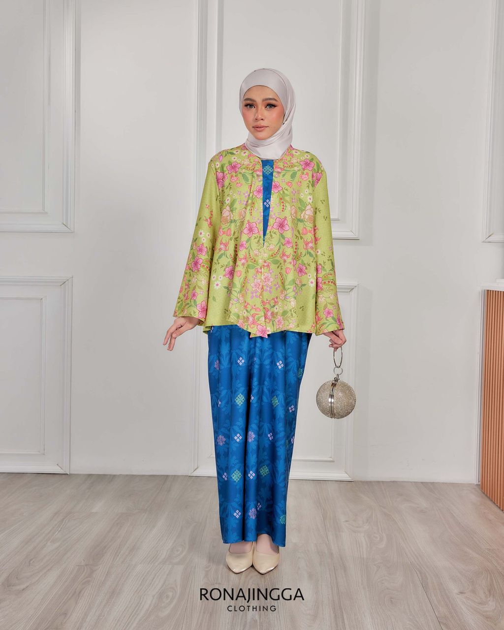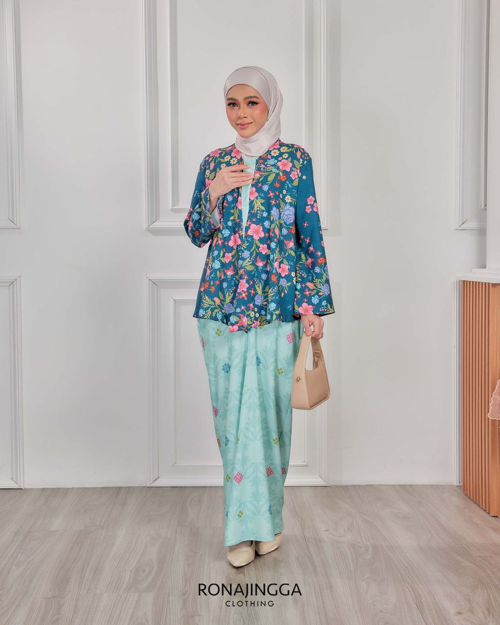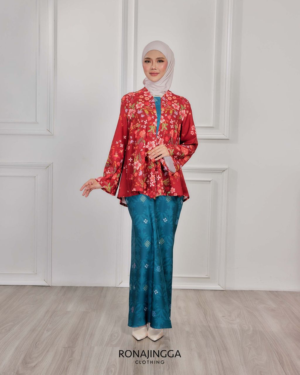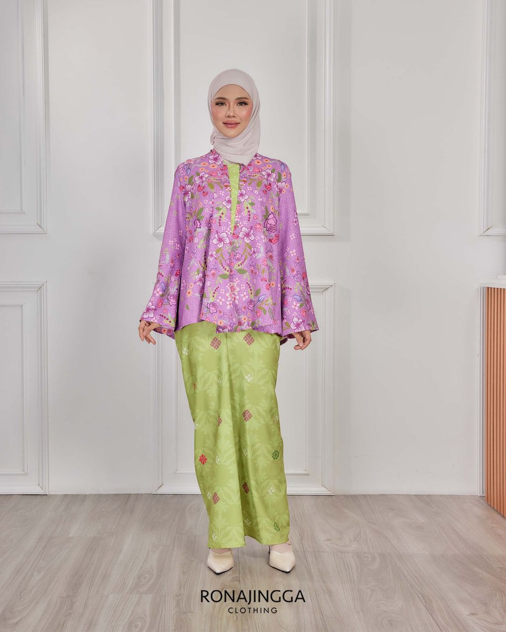 It is a loose, elegant and minimal baggy kebaya made from High Quality Premium Iron-less Soft Italian Crepe with wuduk friendly wide sleeves design , that fits nicely on any body shape and cooling to wear from day to night. The top is a loose baggy top that can even be easily pulled up for breastfeeding and comfortably loose enough for preggy mommy.