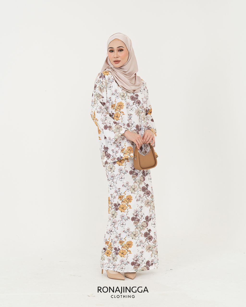 The top is a loose cutting design with side slits that can easily be pulled up for breastfeeding. Thus, the skirt of the kurung is a beautifully cut front overlap skirt (kain selisih) with side pocket that gives a sleek look and comfortably easy to move without showing off your feet.