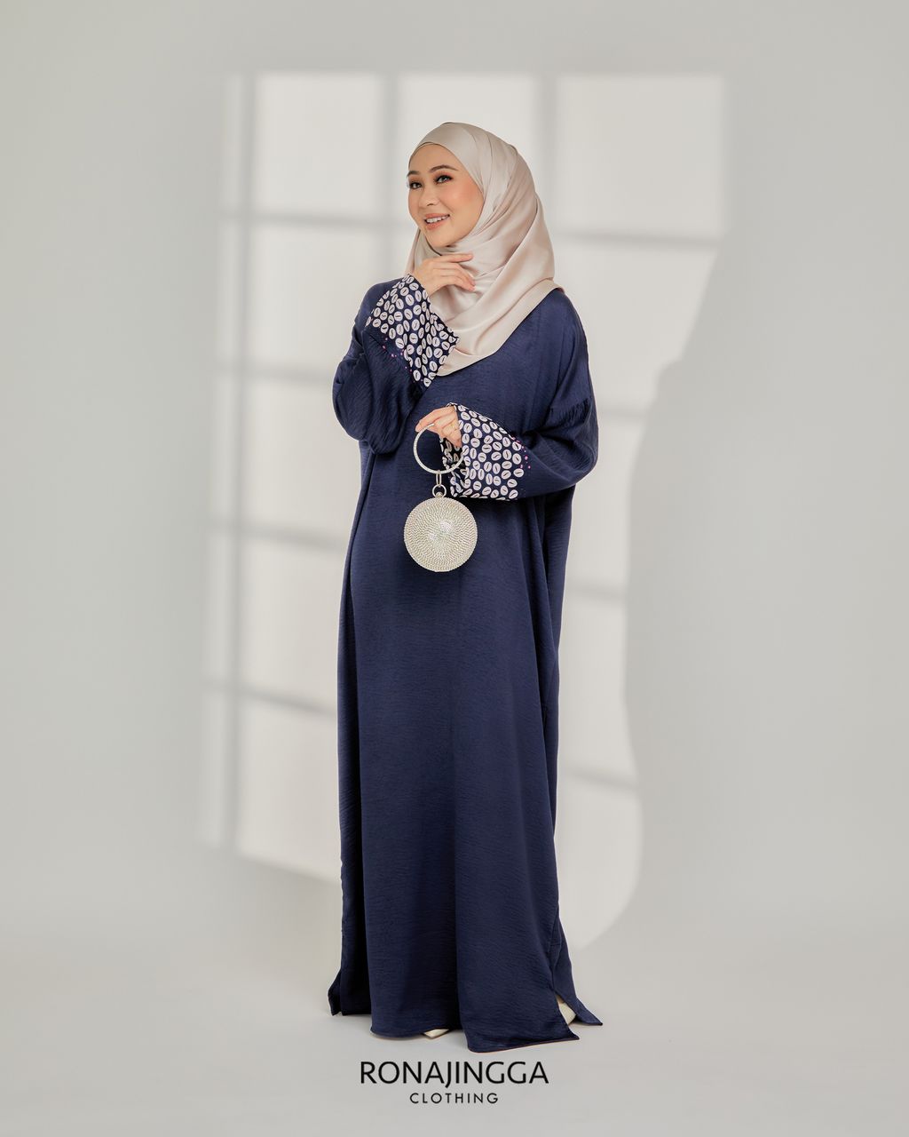 A premium elegant, exclusive, iron-less Loose Kaftan that can be worn both side (front or back) with one large side pocket. The kaftan is design beautifully with whudu' friendly wide sleeves with beautiful printed cuff detailings for an elegant touch. It is flowy and gives a modest elegant look. It is also a Pregnant Mommy and Nursing friendly kaftan with (hidden zipper) for effortless breastfeeding.