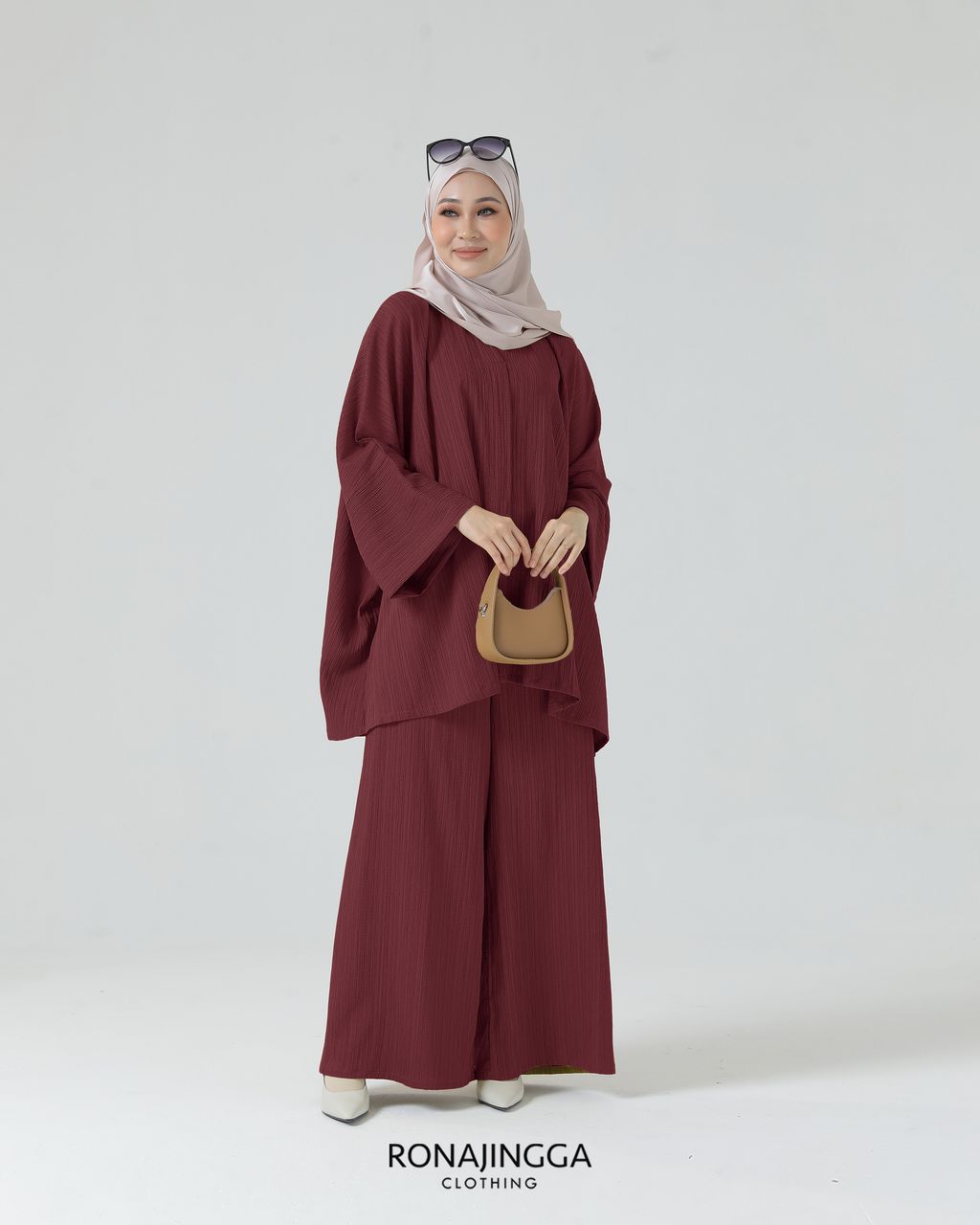 It is a baggy , comfortable and iron-less set made from High Quality Premium Pleated Crush that is cooling and comfy. The front pleated detailing specially designed to give a Sophisticated yet minimal look. Plus, the wide kimono sleeve design that is wuduk / dish washing.The top is a loose baggy top design, can even be easily pulled up for breastfeeding / be worn as maternity wear.